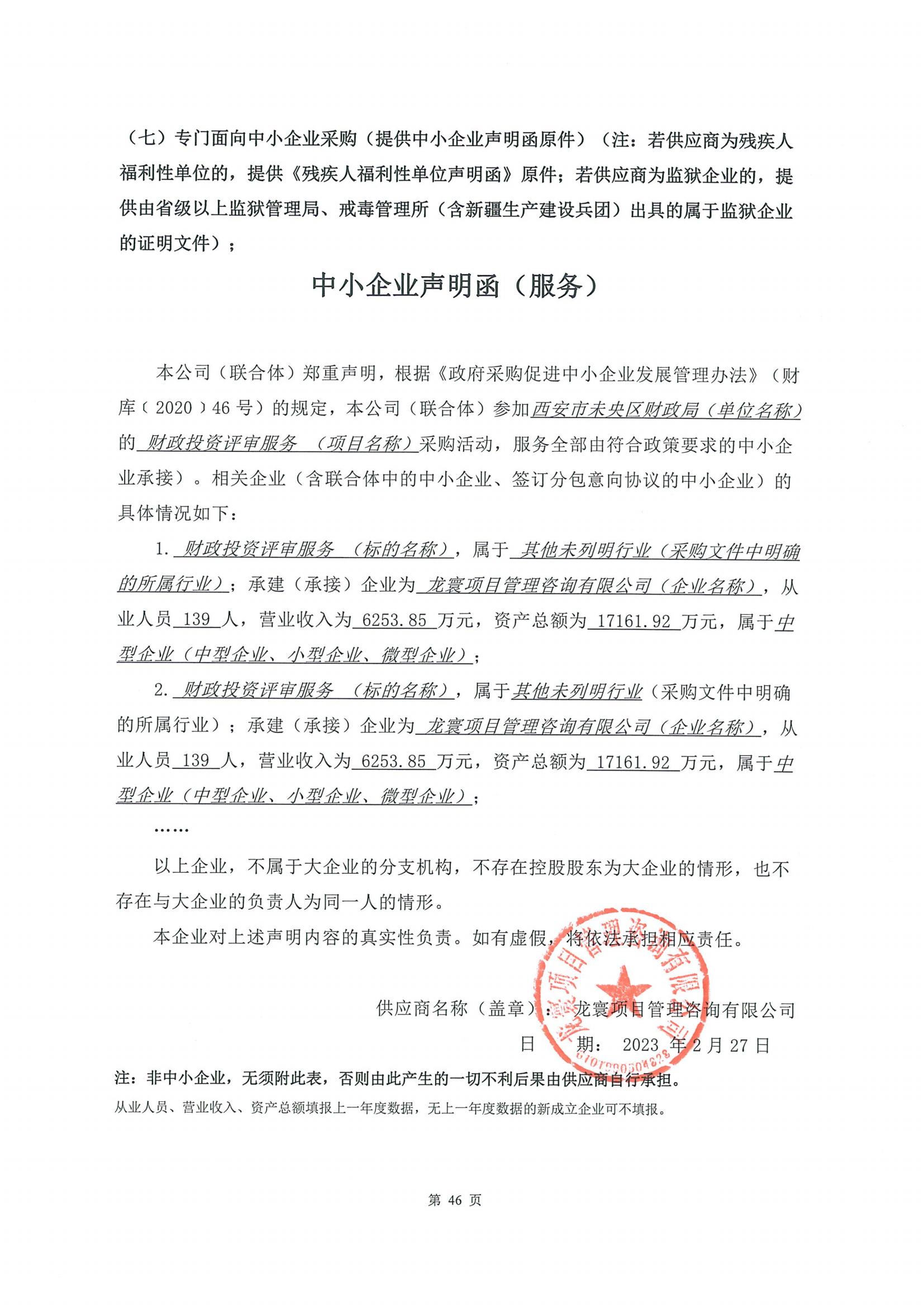 ----------------------------------招标机构发布信息原文:----------------------- 合同包1-龙寰项目管理咨询有限公司.jpg 合同包2-凌辉建设工程咨询有限公司.jpg 合同包3-陕西三秦工程造价咨询有限责任公司.jpg 合同包4-陕西恒业建设集团有限公司.jpg 合同包5-华文项目管理有限公司.jpg 合同包6-中建华阳建设项目管理有限责任公司.jpg 西安市未央区财政局财政投资评审服务中标(成交)明细.pdf 发售版-财政投资评审服务(竞争性磋商文件).pdf 西安市未央区财政局财政投资评审服务中标(成交)明细(补充).pdf 十一、其他事项: ------------------------------------招标信息结束---------------------------- 标签: 中标 财政局 西安市 财政 公告 上一篇: 2023年3月2日南安市龙风中学食堂食品配送服务采购结果公告(合同包 1 ) 最新5000条招标信息列表: 滚动招标 |