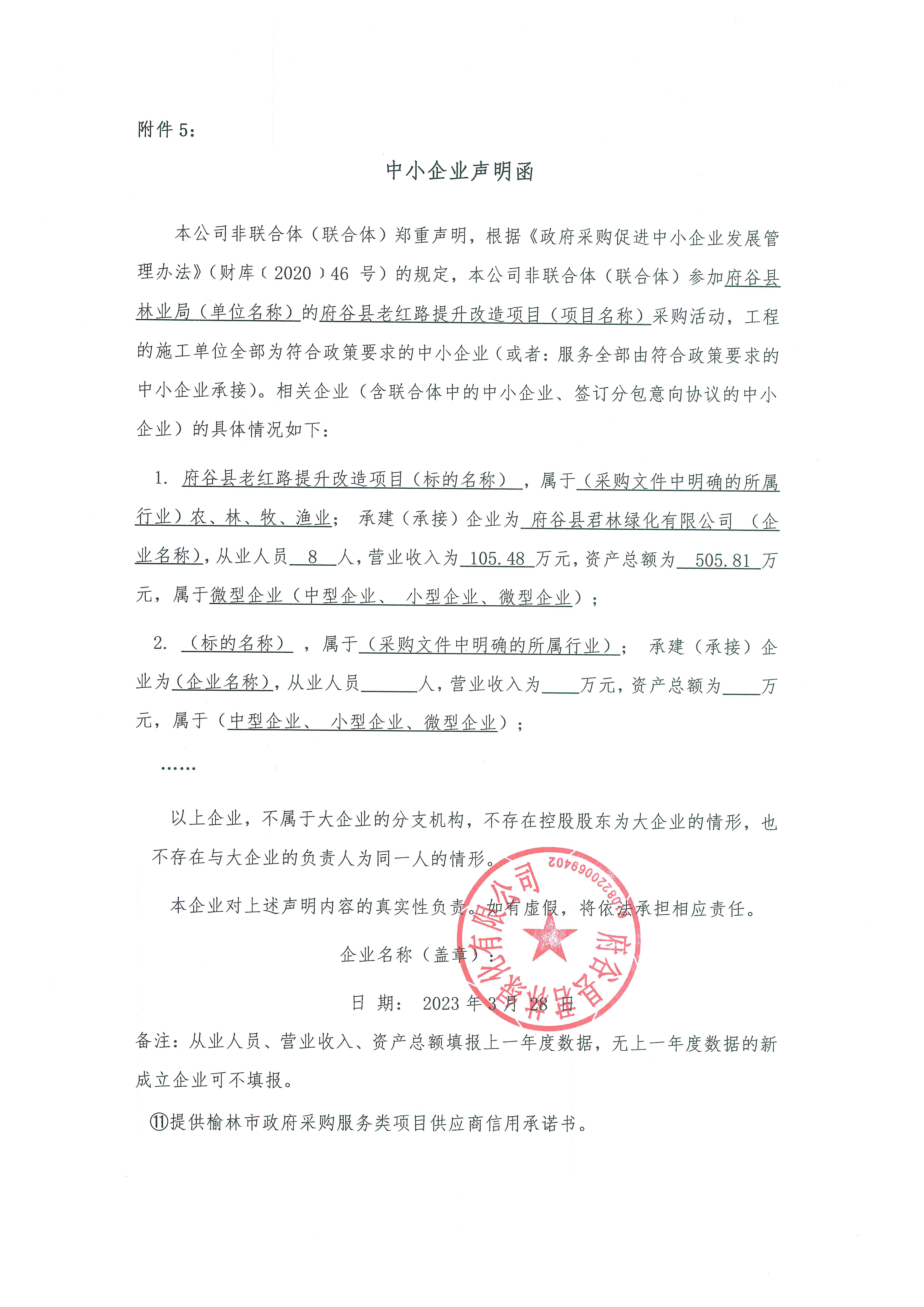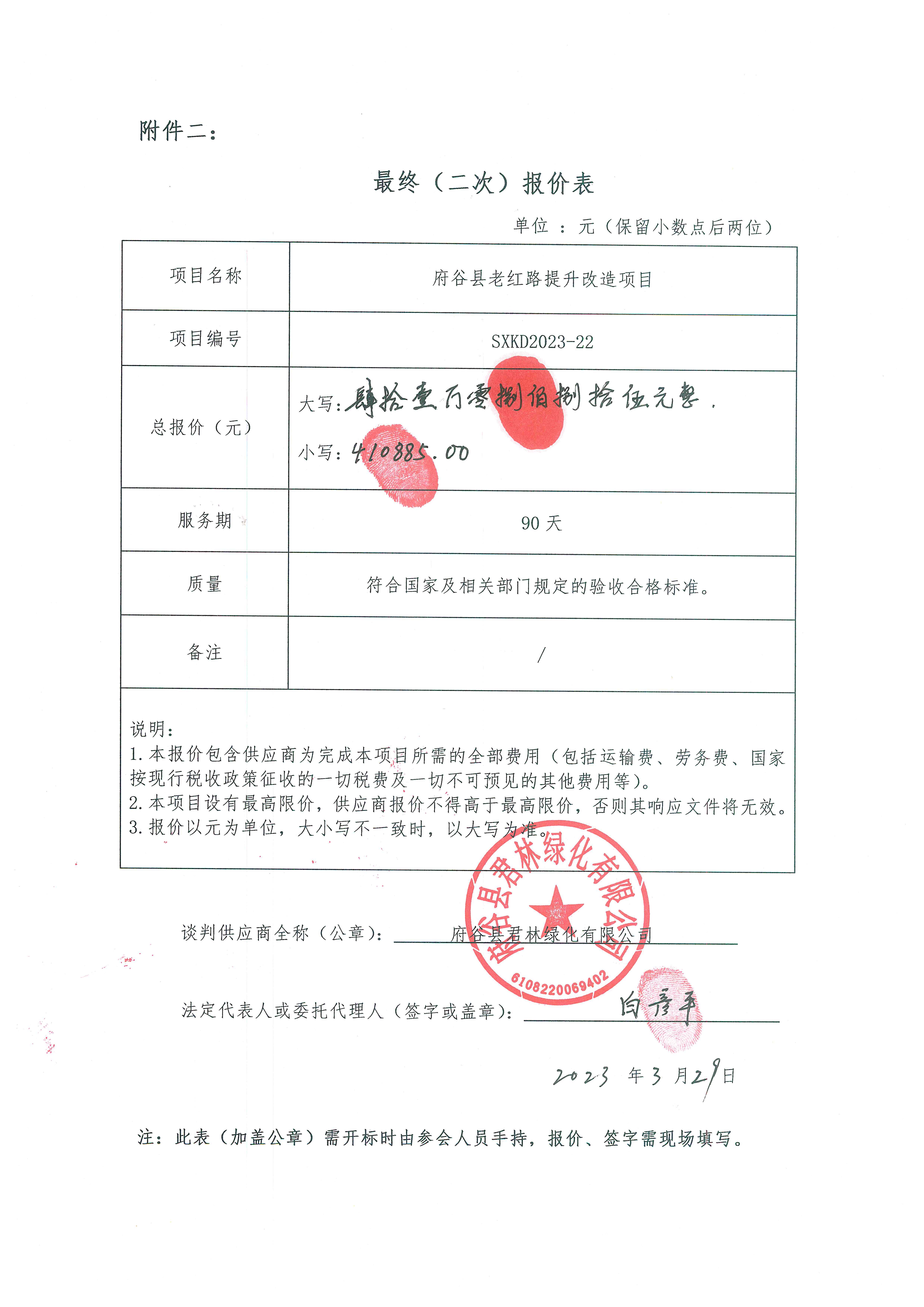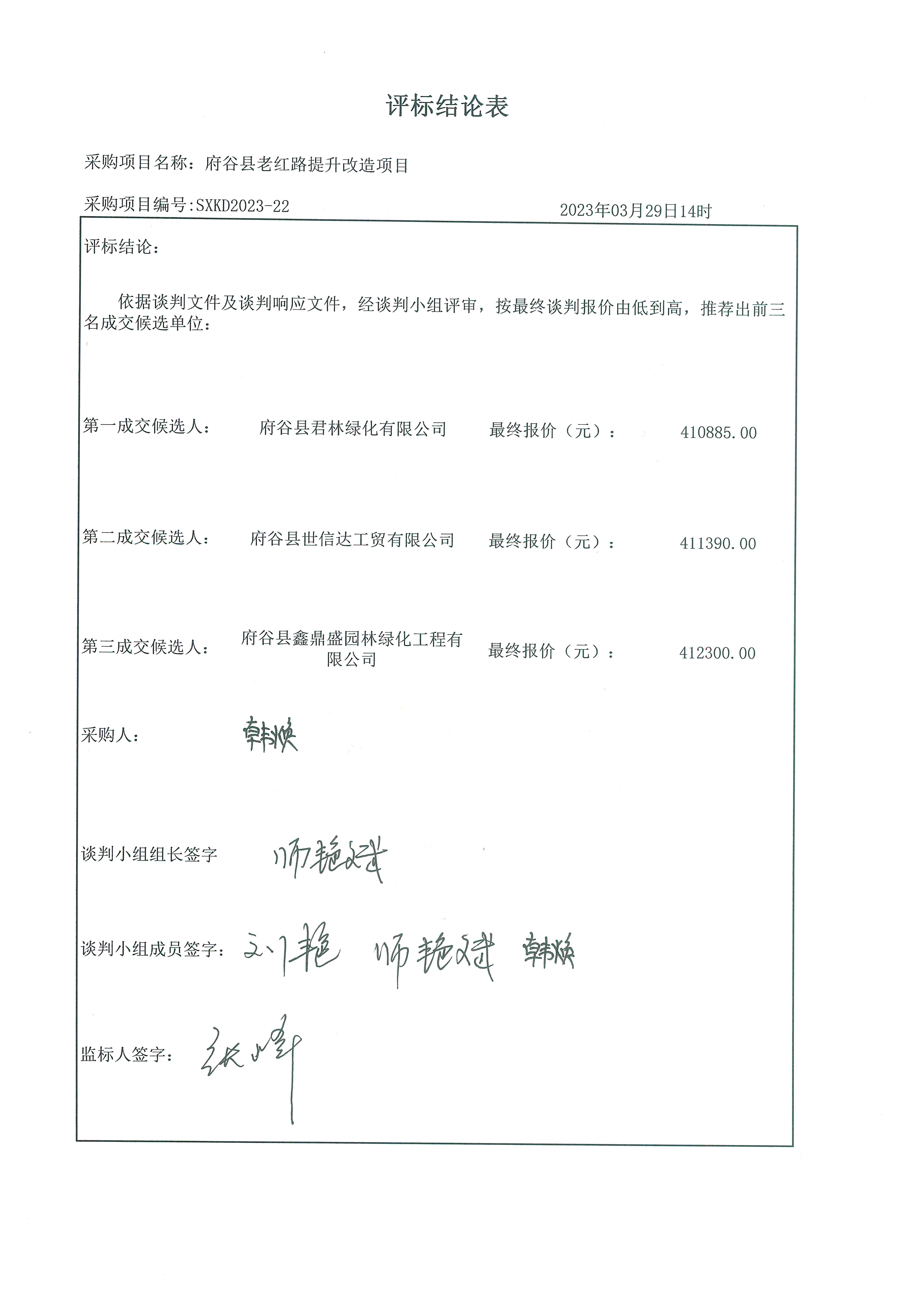 ----------------------------------招标机构发布信息原文:----------------------- 【22号老红路绿化项目】-谈判文件.pdf 府谷县林业局本级府谷县老红路提升改造项目中标(成交)明细.pdf 二次报价表.jpg 评标结论表.jpg 中小企业声明函.jpg 十一、其他事项: ------------------------------------招标信息结束---------------------------- 标签: 中标 府谷县 改造项目 公告 老红路 上一篇: 2023年4月1日云霄县马铺乡人民政府食堂管理服务费中标公告 最新5000条招标信息列表: 滚动招标 |