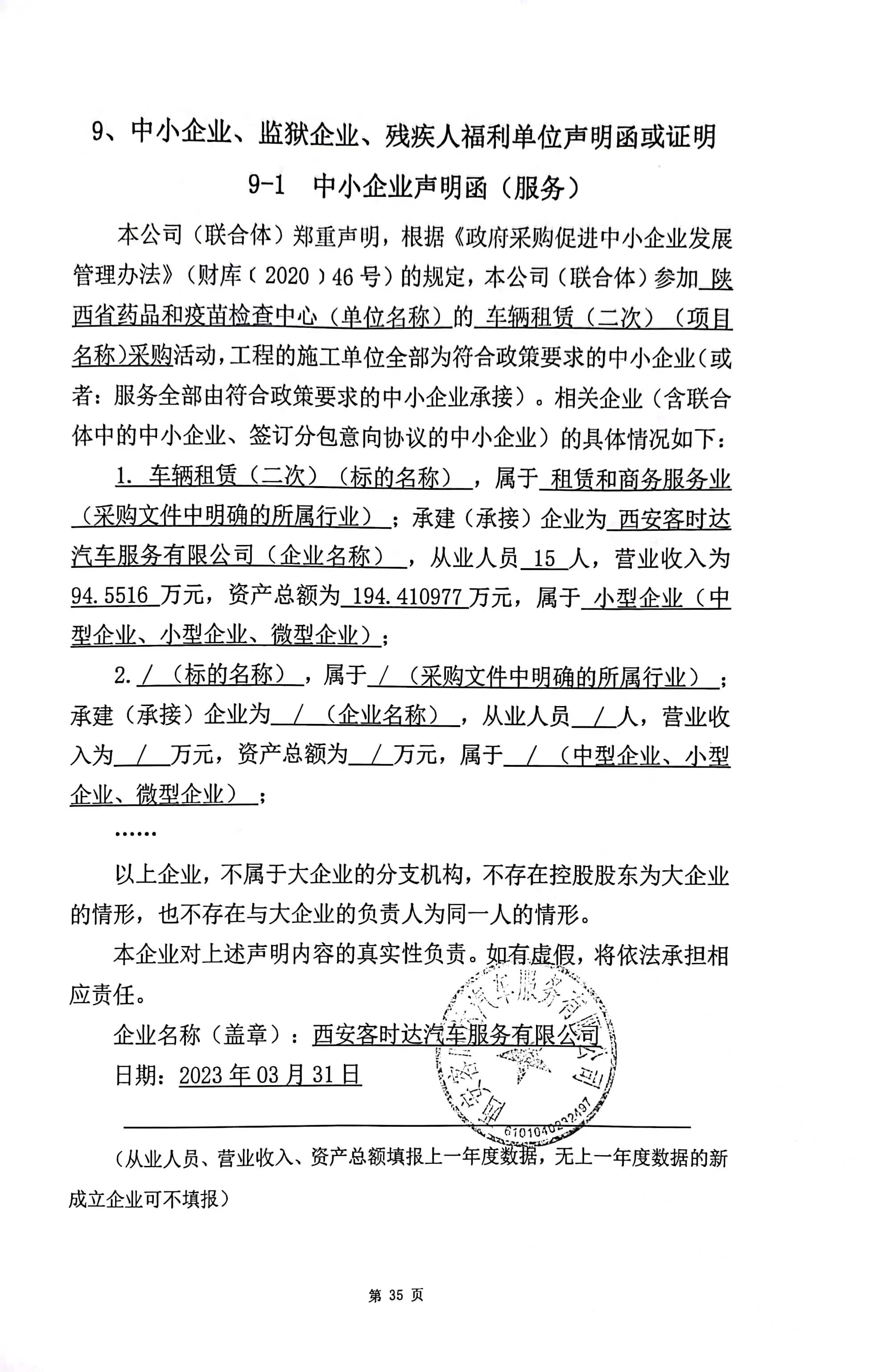 ----------------------------------招标机构发布信息原文:----------------------- 中小企业声明函.jpg 陕西省药品和疫苗检查中心车辆租赁(二次)中标(成交)明细.pdf 车辆租赁(二次)竞争性磋商文件(2022版)V3.docx 最后分项报价表.pdf 十一、其他事项: ------------------------------------招标信息结束---------------------------- 标签: 陕西省 疫苗 车辆 药品 公告 中心 上一篇: 2023年4月3日宣汉县民政局宣汉县购买居家养老服务中标(成交)结果公告 最新5000条招标信息列表: 滚动招标 |