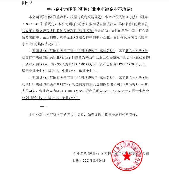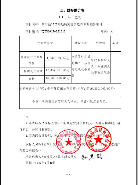 ----------------------------------招标机构发布信息原文:----------------------- 紫阳县自然资源局紫阳县2023年地质灾害普适性监测预警项目中标(成交)明细.pdf 中小企业声明函.jpg 投标报价表.png (3.9论证版)紫阳县2023年地质灾害普适性监测预警项目.doc 十一、其他事项: ------------------------------------招标信息结束---------------------------- 标签: 中标 项目 紫阳县 地质灾害 公告 普适性 上一篇: 2023年4月4日东莞市中医院总院ICU电阻抗肺监测等医疗设备采购项目中标公告 最新5000条招标信息列表: 滚动招标 |