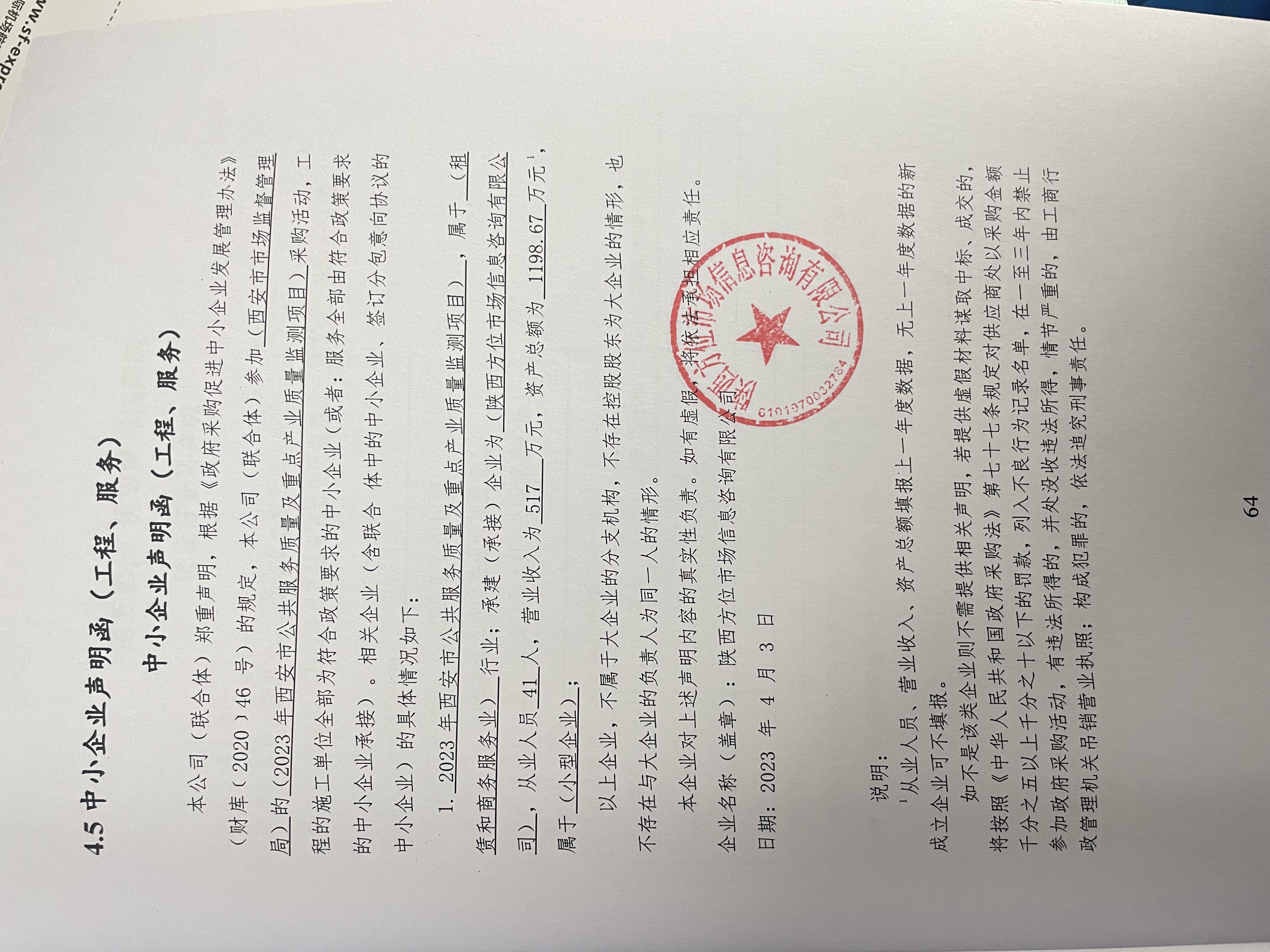 ----------------------------------招标机构发布信息原文:----------------------- 2023年西安市公共服务质量及重点产业质量监测报价明细附件.pdf 2023年西安市公共服务质量及重点产业质量监测磋商文件(322175537).pdf CS1020中小企业声明函.jpg 十一、其他事项: ------------------------------------招标信息结束---------------------------- 标签: 中标 西安市 服务质量 监督管理局 重点 质量监测 产业 上一篇: 2023年4月4日成都市青白江区综合行政执法局城乡环境综合治理第三方测评竞争性磋商结果公告 最新5000条招标信息列表: 滚动招标 |