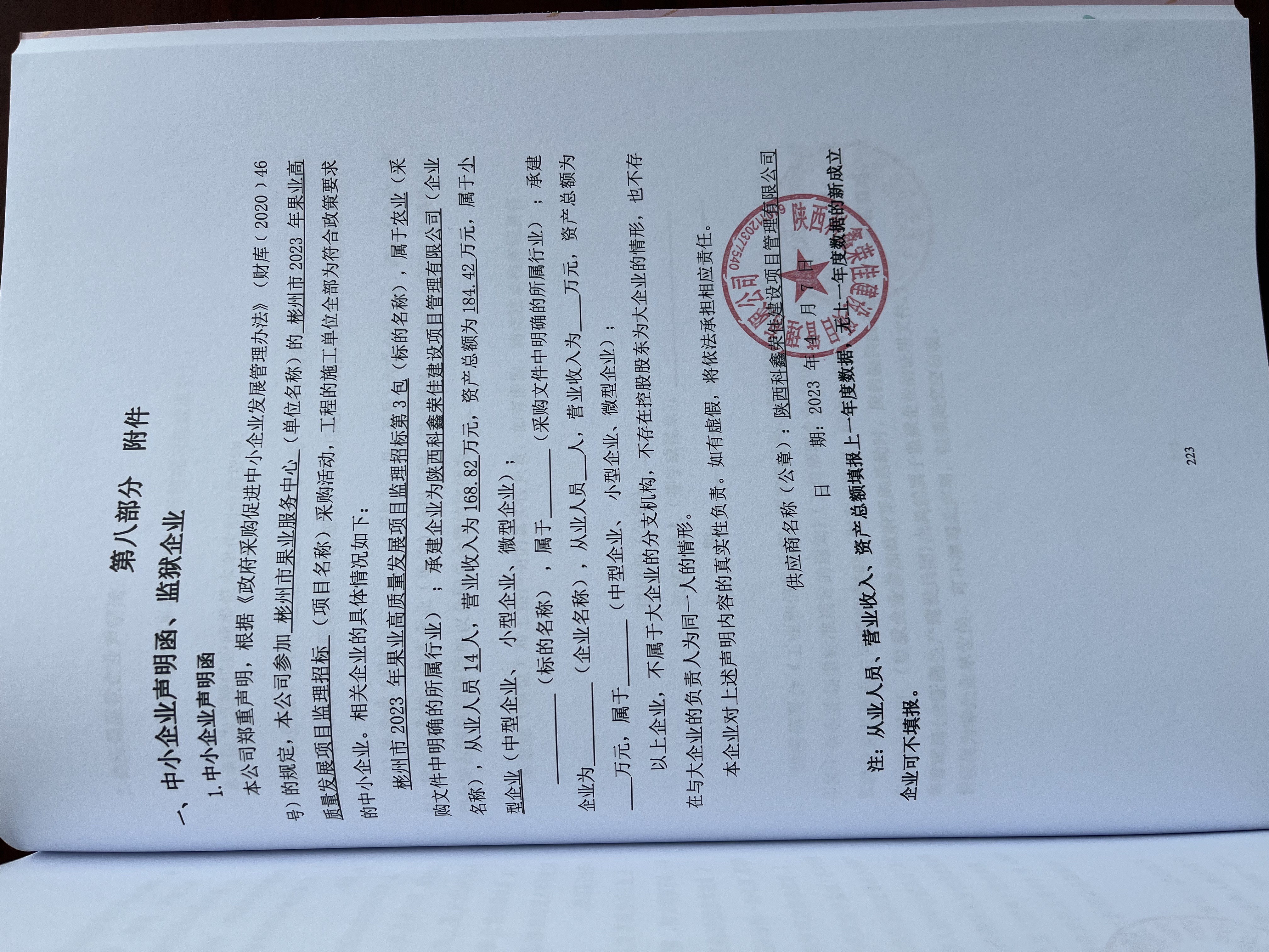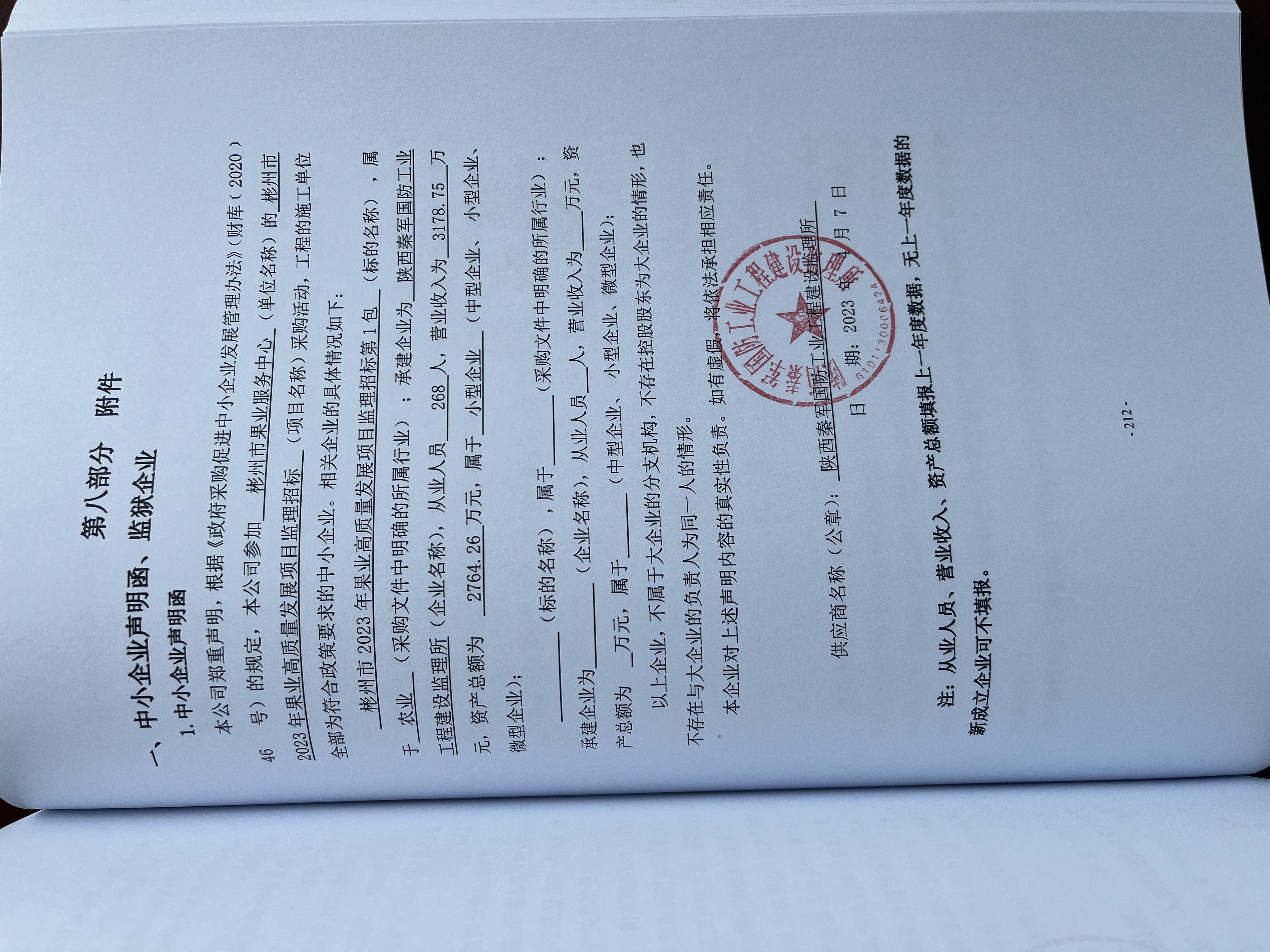 ----------------------------------招标机构发布信息原文:----------------------- 第1包中小企业声明函.jpg 磋商文件--彬州市2023年果业高质量发展项目监理招标.doc 第2包中小企业声明函.jpg 第3包中小企业声明函.jpg 彬州市果业服务中心彬州市2023年果业高质量发展项目监理招标中标(成交)明细.pdf 十一、其他事项: ------------------------------------招标信息结束---------------------------- 标签: 项目 中标 招标 果业 高质量 服务中心 公告 上一篇: 2023年4月10日加盖车库顶棚项目工程总承包中标候选人公告 最新5000条招标信息列表: 滚动招标 |