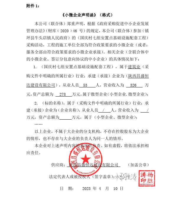 ----------------------------------招标机构发布信息原文:----------------------- 国庆村七组安置点基础设施配套工程(2).doc 声明函.png 镇坪县牛头店镇人民政府(本级)国庆村七组安置点基础设施配套工程中标(成交)明细.pdf 十一、其他事项: ------------------------------------招标信息结束---------------------------- 标签: 中标 工程 镇坪县 牛头 基础设施 国庆 店镇 上一篇: 2023年4月11日诉服中心房屋租赁服务中标(成交)结果公告 最新5000条招标信息列表: 滚动招标 |