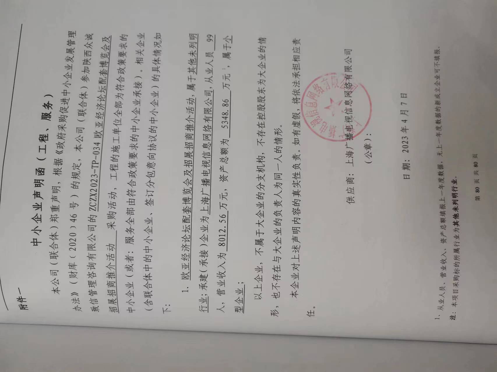 ----------------------------------招标机构发布信息原文:----------------------- 中小企业声明函.jpg 西安市博览事务中心欧亚经济论坛配套博览会及招展招商推介活动中标(成交)明细.pdf 欧亚经济论坛配套博览会及招展招商推介活动.doc 十一、其他事项: ------------------------------------招标信息结束---------------------------- 标签: 欧亚 西安市 博览会 经济论坛 事务 公告 中心 上一篇: 2023年4月11日2022年度陈江街道“厕所革命”整改工程中标结果公告 最新5000条招标信息列表: 滚动招标 |