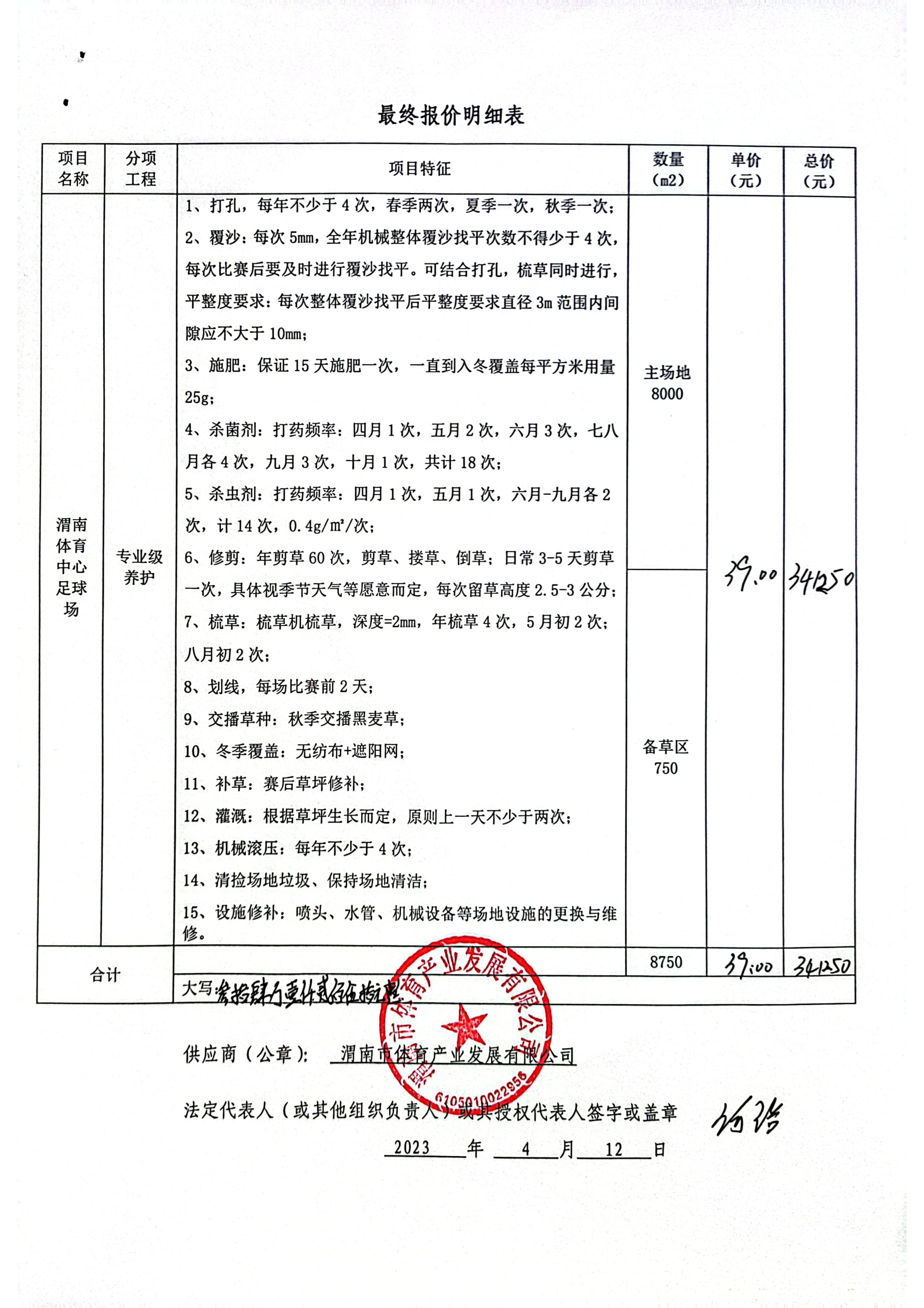 2023年4月13日渭南市体育中心2023年足球场草坪养护项目成交结果公告 |