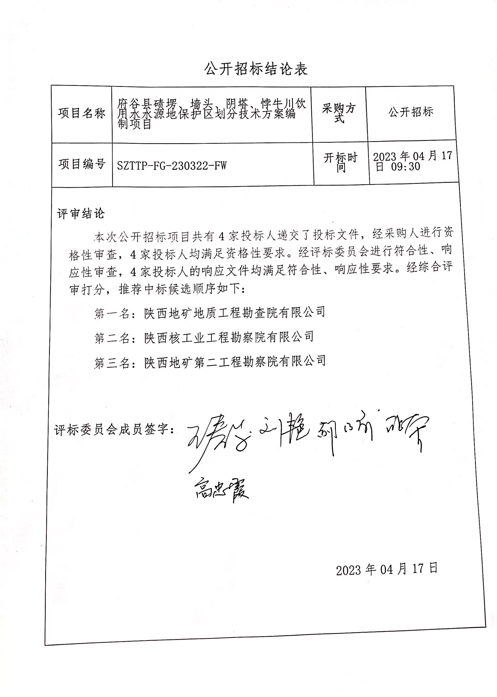 2023年4月18日府谷县碛塄、墙头、阴塔、悖牛川饮用水水源地保护区划分技术方案编制项目中标(成交)结果公告 |