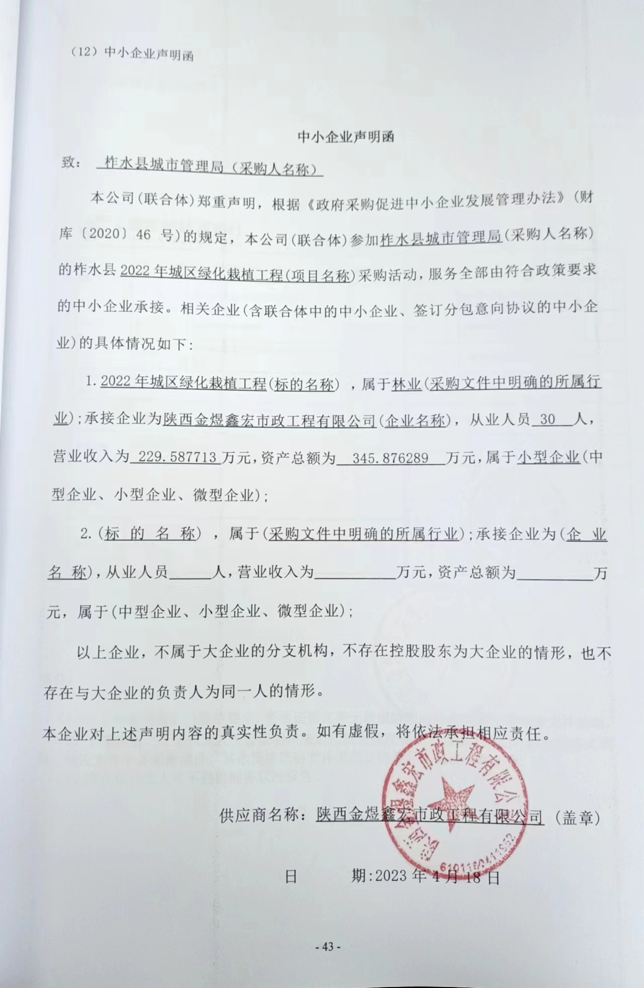 ----------------------------------招标机构发布信息原文:----------------------- 声明函.jpg 柞水县城市管理局柞水县2022年城区绿化栽植工程中标(成交)明细.pdf 十一、其他事项: ------------------------------------招标信息结束---------------------------- 标签: 中标 工程 柞水县 管理局 城区 公告 城市 上一篇: 2023年4月19日上汽大众汽车有限公司2023工伤预防宣传项目中标候选人公告 最新5000条招标信息列表: 滚动招标 |