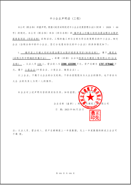 ----------------------------------招标机构发布信息原文:----------------------- 镇坪县上竹镇人民政府(本级)镇坪县上竹镇大坝村沟渠治理及水毁护堤修复项目中标(成交)明细.pdf 镇坪县上竹镇大坝村沟渠治理及水毁护堤修复项目——磋商文件(定版4.10).docx 中小企业声明函(大坝沟渠).png 十一、其他事项: ------------------------------------招标信息结束---------------------------- 标签: 中标 项目 镇坪县 沟渠 大坝 公告 上竹镇 上一篇: 2023年4月24日镇坪县上竹镇人民政府(本级)镇坪县上竹镇庙坝村中药烤烟种植基地建设项目中标(成交)结果公告 最新5000条招标信息列表: 滚动招标 |