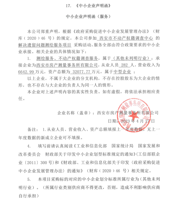 ----------------------------------招标机构发布信息原文:----------------------- 西安市不动产权籍调查中心解决遗留问题测绘服务项目中标(成交)明细.pdf 西安市不动产权籍调查中心解决遗留问题业务经费项目 磋商(4.14).doc 中小企业声明函.png 十一、其他事项: ------------------------------------招标信息结束---------------------------- 标签: 西安市 不动 服务项目 遗留问题 产权 公告 中心 上一篇: 2023年5月4日林口县水务局遗留工程决算审计服务中标公告 最新5000条招标信息列表: 滚动招标 |