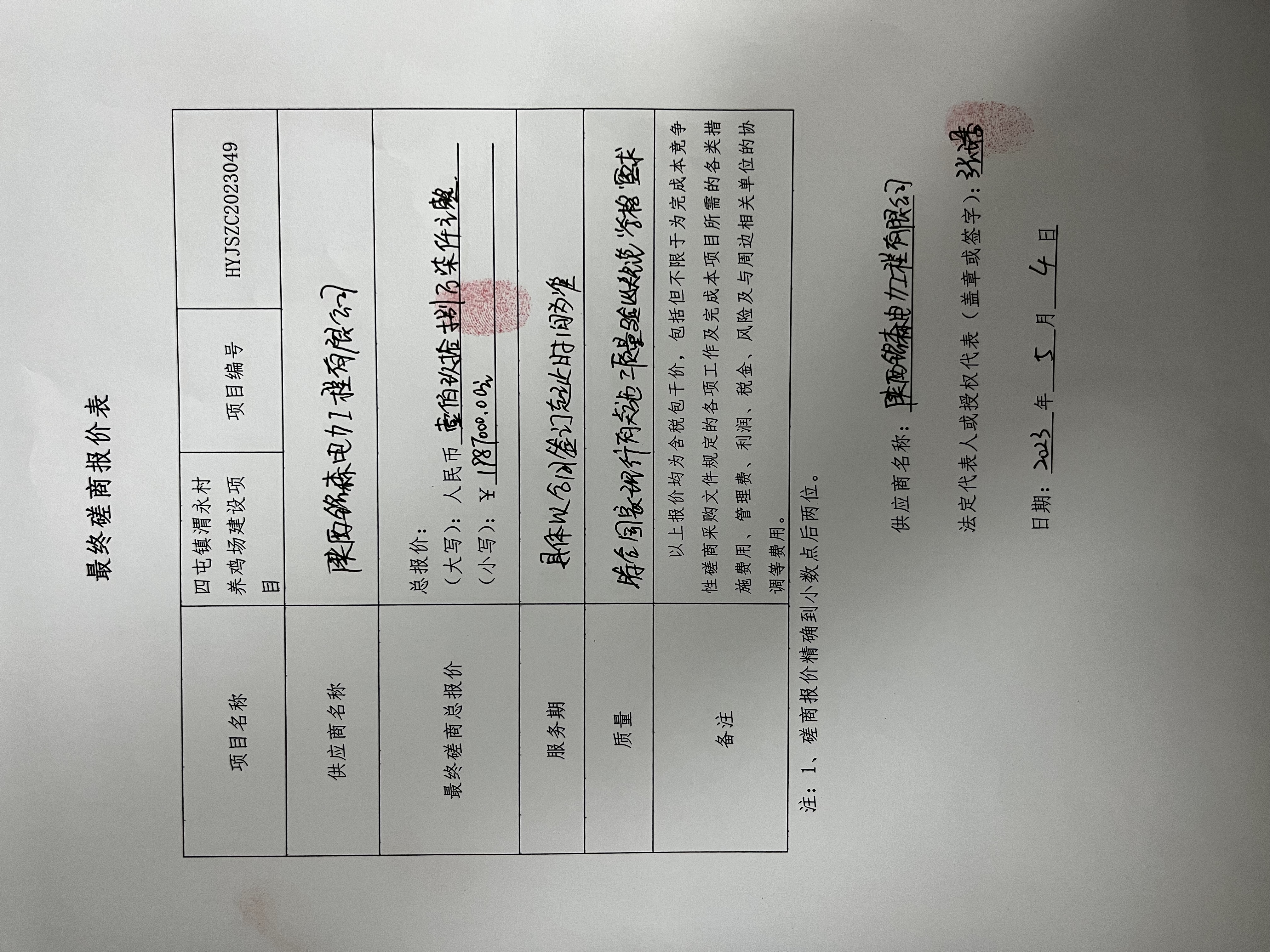 ----------------------------------招标机构发布信息原文:----------------------- 周至县四屯镇人民政府四屯镇渭永村养鸡场建设项目中标(成交)明细.pdf 四屯镇渭永村养鸡场建设项目-竞争性磋商文件终稿2023.4.19.pdf 中小企业声明函.jpg 最终报价表.jpg 十一、其他事项: ------------------------------------招标信息结束---------------------------- 标签: 中标 周至县 养鸡场 建设项目 公告 四屯镇 四屯镇渭永村 上一篇: 2023年5月5日中国人民政治协商会议陕西省佳县委员会办公室佳县政协办公室劳务外包项目中标(成交)结果公告 最新5000条招标信息列表: 滚动招标 |