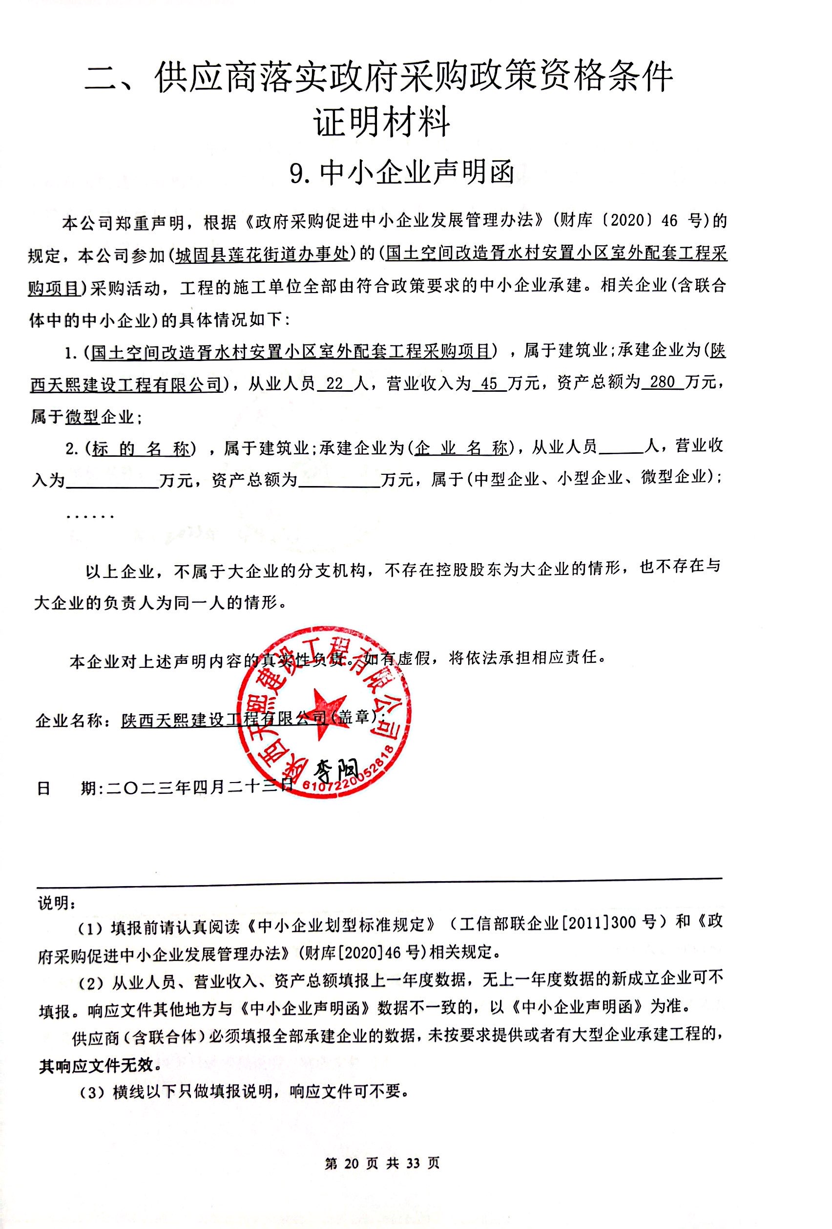 ----------------------------------招标机构发布信息原文:----------------------- 国土空间改造胥水村安置小区室外配套工程采购项目竞争性磋商文件(1).pdf 中小企业声明函.jpg 城固县莲花街道办事处国土空间改造胥水村安置小区室外配套工程采购项目中标(成交)明细.pdf 二次报价.jpg 十一、其他事项: ------------------------------------招标信息结束---------------------------- 标签: 采购 莲花 项目 工程 中标 城固县 室外 上一篇: 2023年5月9日武进公共卫生服务中心中央空调更换中标公告 最新5000条招标信息列表: 滚动招标 |