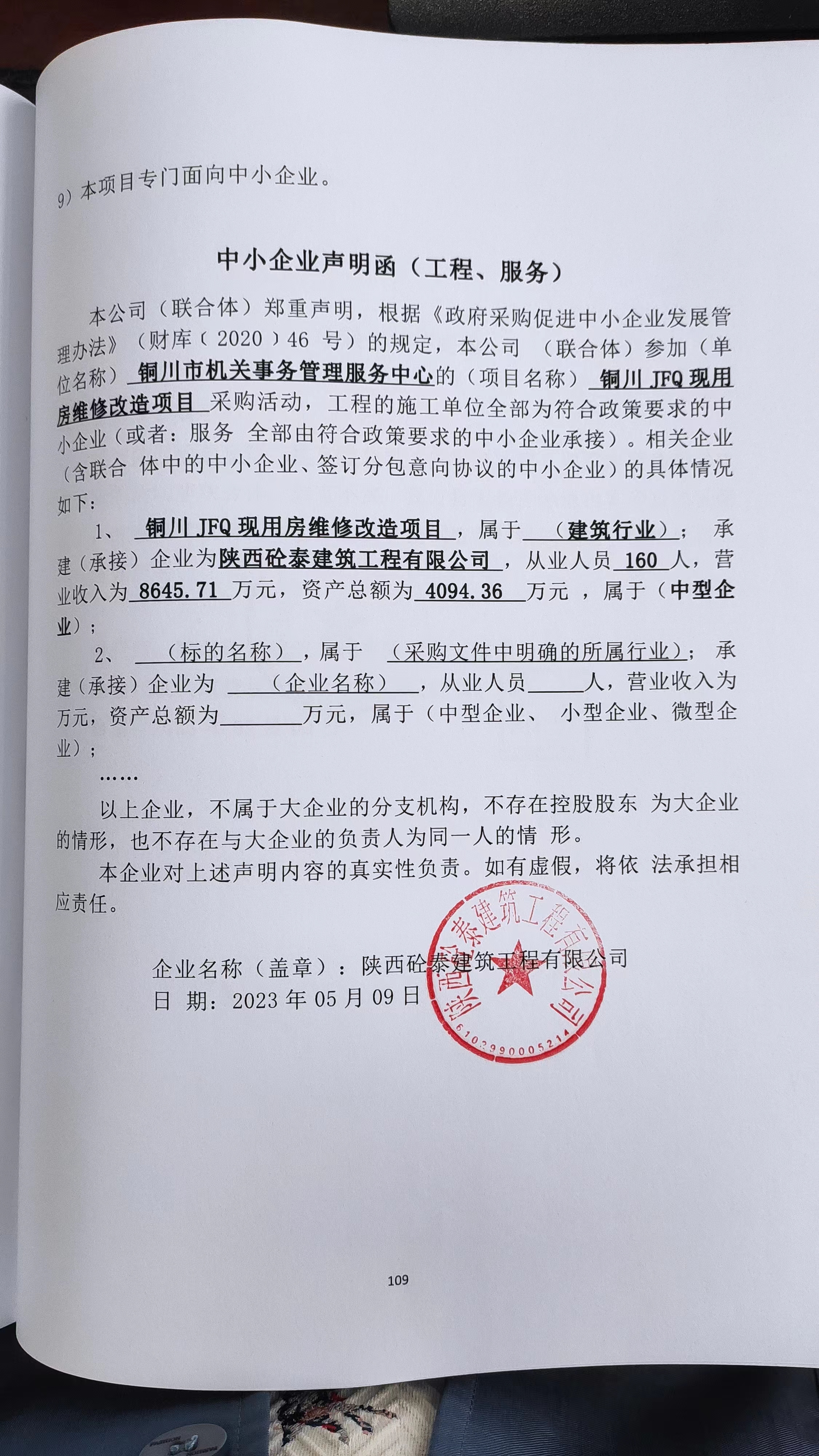 ----------------------------------招标机构发布信息原文:----------------------- 中小企业声明函.jpg 铜川市机关事务管理服务中心铜川JFQ现用房维修改造项目中标(成交)明细.pdf 十一、其他事项: ------------------------------------招标信息结束---------------------------- 标签: 中标 铜川 铜川市 事务管理 改造项目 服务中心 机关 上一篇: 2023年5月10日包头市昆都仑区住房和城乡建设局昆河北3号、北4号橡胶坝袋采购及安装项目结果公告 最新5000条招标信息列表: 滚动招标 |