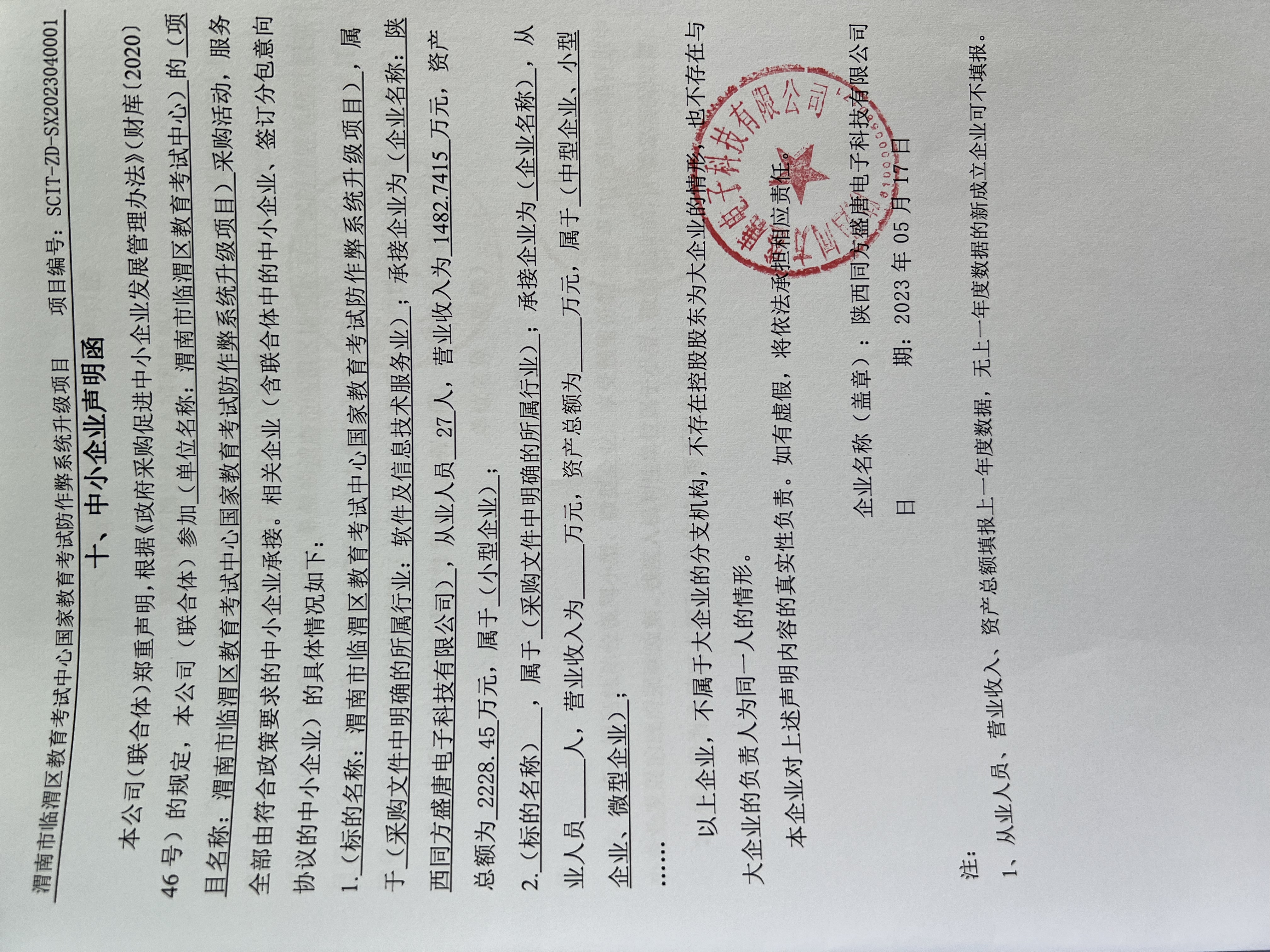 ----------------------------------招标机构发布信息原文:----------------------- 渭南市临渭区教育考试中心国家教育考试防作弊系统升级项目中标(成交)明细.pdf 040001渭南市临渭区国家教育考试防作弊系统升级项目.docx 报价函.pdf 中小企业声明函.jpg 十一、其他事项: ------------------------------------招标信息结束---------------------------- 标签: 中标 项目 渭南市 考试中心 教育考试 系统升级 公告 上一篇: 2023年5月17日自然资源成果档案管理服务流程优化中标公告 最新5000条招标信息列表: 滚动招标 |