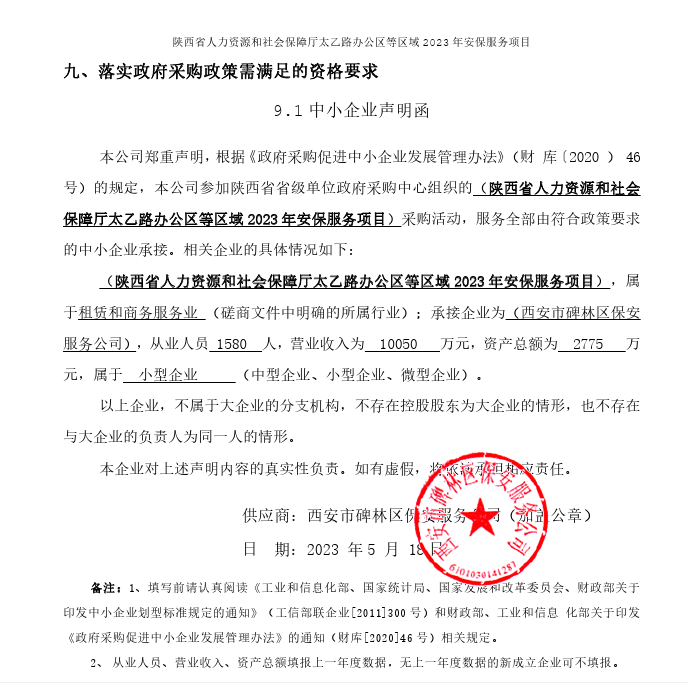 ----------------------------------招标机构发布信息原文:----------------------- 中小企业声明函.png 省人力资源和社会保障厅机关服务中心陕西省人力资源和社会保障厅太乙路办公区等区域2023年安保服务项目中标(成交)明细.pdf 最终报价表.png 十一、其他事项: ------------------------------------招标信息结束---------------------------- 标签: 中标 社会保障 陕西省 人力资源 安保 服务项目 太乙 上一篇: 2023年5月24日阳春市机关事务管理处购买保安服务采购项目结果公告 最新5000条招标信息列表: 滚动招标 |