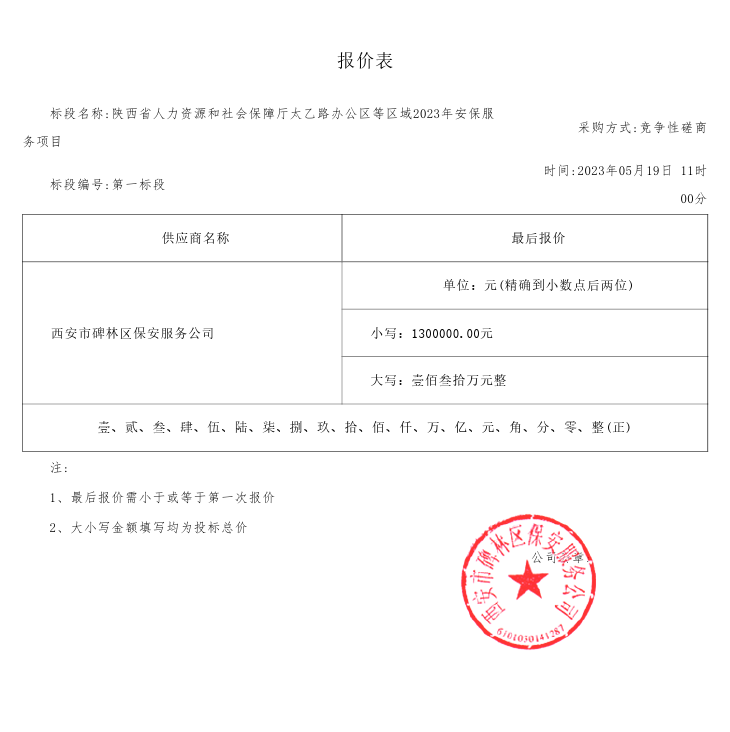 2023年5月24日省人力资源和社会保障厅机关服务中心陕西省人力资源和社会保障厅太乙路办公区等区域2023年安保服务项目中标(成交)结果公告 |