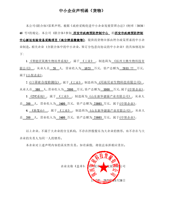 ----------------------------------招标机构发布信息原文:----------------------- 西安市疾病预防控制中心新址实验设备采购(高分辨显微镜等)中标(成交)明细.pdf 西安市疾病预防控制中心新址实验设备采购(高分辨显微镜等)-包1.doc 西安市疾病预防控制中心新址实验设备采购(高分辨显微镜等) -包2.doc 西安市疾病预防控制中心新址实验设备采购(高分辨显微镜等) -包3.doc 中小企业声明函(包3).png 西安市疾病预防控制中心新址实验设备采购(高分辨显微镜等)主要标的信息.doc 十一、其他事项: ------------------------------------招标信息结束---------------------------- 标签: 中标 西安市 新址 显微镜 疾病预防控制中心 设备采购 公告 上一篇: 2023年5月30日青海鼎晟工程项目管理有限公司关于玉树州“百、千、万”产业—囊谦县生态畜牧业合作社标准化建设提升及短板工程项目的中标(成交)结果公告 最新5000条招标信息列表: 滚动招标 |