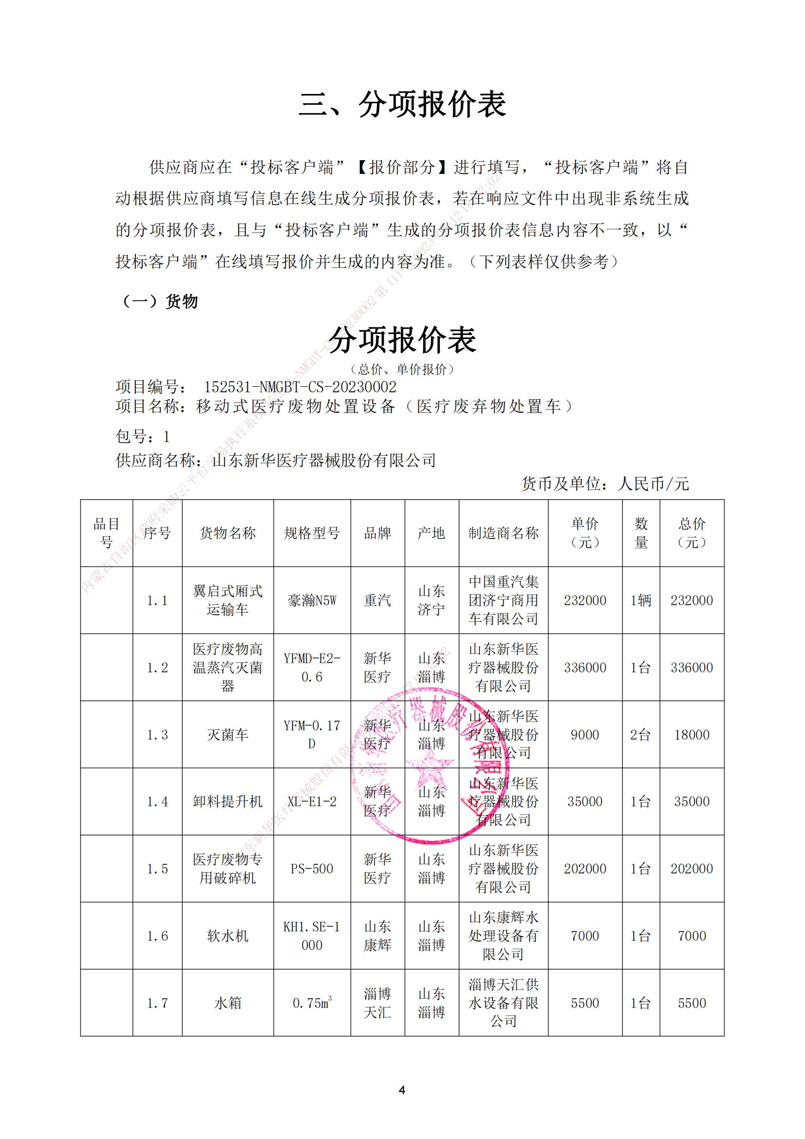 ----------------------------------招标机构发布信息原文:----------------------- 移动式医疗废物处置设备(医疗废弃物处置车)报价明细附件.pdf 分项报价表1.jpg 分项报价表2.jpg 十一、其他事项: ------------------------------------招标信息结束---------------------------- 标签: 多伦县 医疗 废弃物 废物 移动式 委员会 公告 上一篇: 2023年6月14日山东省农业科学院休闲农业所仪器设备项目采购中标(成交)公告 最新5000条招标信息列表: 滚动招标 |