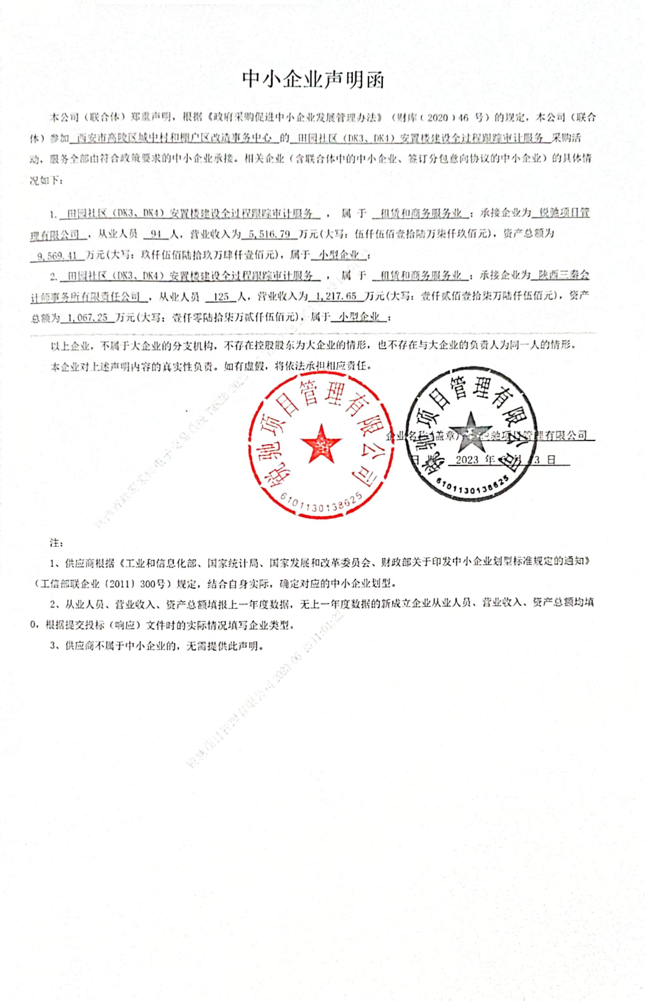 ----------------------------------招标机构发布信息原文:----------------------- 田园社区(DK3、DK4)安置楼建设全过程跟踪审计服务报价明细附件.pdf 中小企业声明函.jpg 田园社区(DK3、DK4)安置楼建设全过程跟踪审计服务招标文件(524153141).pdf 十一、其他事项: ------------------------------------招标信息结束---------------------------- 标签: 中标 高陵 西安市 棚户区 田园 全过程 城中村 上一篇: 2023年6月16日龙江银行股份有限公司龙江银行--机构装饰装修及配套工程项目(第一包)中标公告 最新5000条招标信息列表: 滚动招标 |