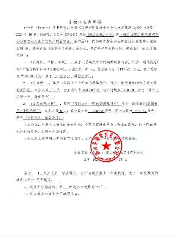----------------------------------招标机构发布信息原文:----------------------- 中小企业声明函.jpg 靖边县靖边中学靖边中学学生公寓楼六位连体双层床购置项目中标(成交)明细.pdf 十一、其他事项: ------------------------------------招标信息结束---------------------------- 标签: 靖边 项目 中标 靖边县 双层床 中学 六位 上一篇: 2023年6月20日子洲县农业农村局关于农改厕设施设备安装采购项目中标(成交)结果公告 最新5000条招标信息列表: 滚动招标 |