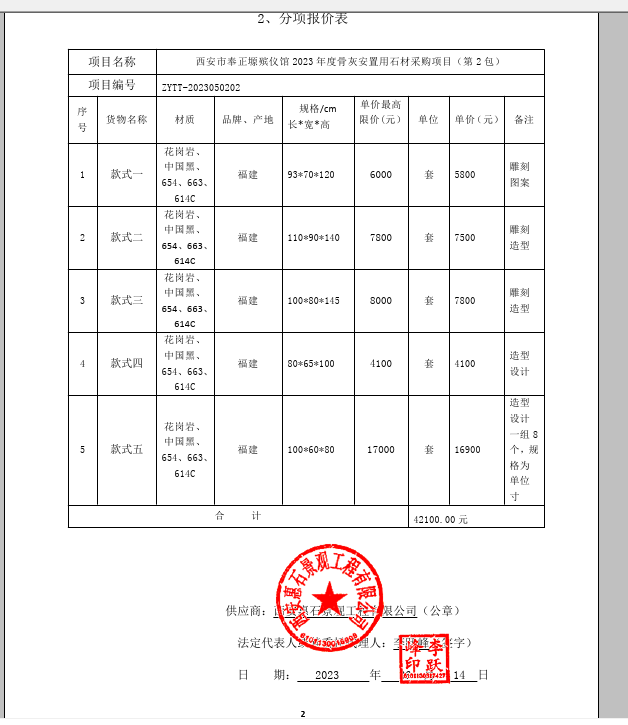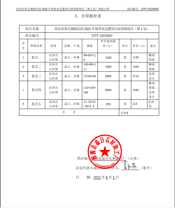 2023年6月20日西安市奉正塬殡仪馆2023年度骨灰安置用石材采购项目中标(成交)结果公告 |