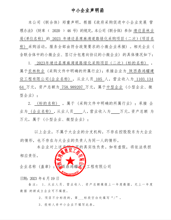 ----------------------------------招标机构发布信息原文:----------------------- 靖边县林业局2023年靖边县席麻湾镇道路绿化采购项目(二次)中标(成交)明细.pdf 中小企业声明函.png 十一、其他事项: ------------------------------------招标信息结束---------------------------- 标签: 采购 中标 项目 靖边县 道路 公告 席麻湾镇 上一篇: 2023年6月21日2023年全城区主干道排水管网疏通清理采购项目(二次)中标(成交)结果公告 最新5000条招标信息列表: 滚动招标 |