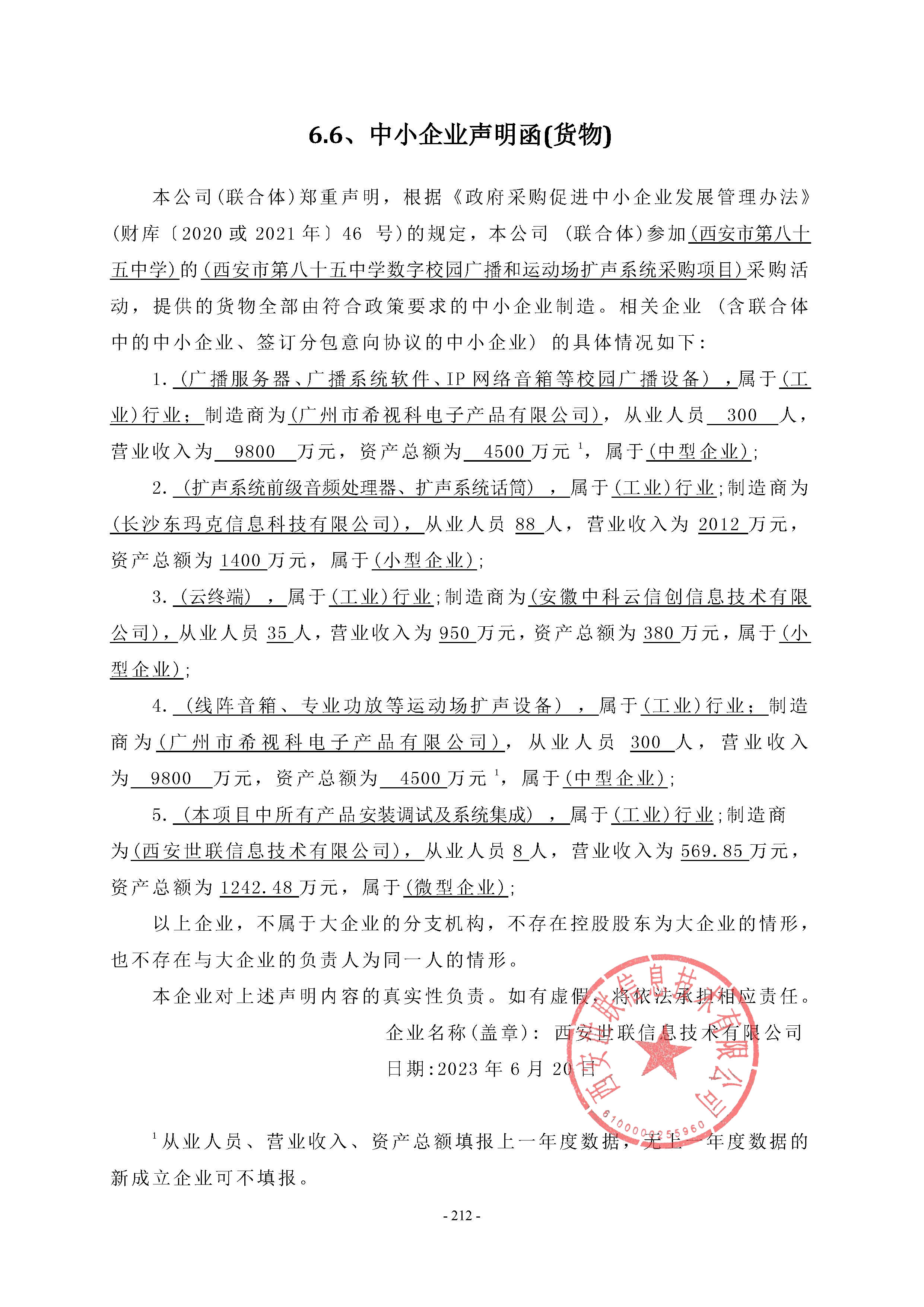 ----------------------------------招标机构发布信息原文:----------------------- 西安市第八十五中学数字校园广播和运动场扩声系统采购项目中标(成交)明细.pdf 磋商文件(定稿).pdf DOC.docx 声明函.jpg 十一、其他事项: ------------------------------------招标信息结束---------------------------- 标签: 项目 采购 西安市 运动场 数字 中学 公告 上一篇: 2023年6月25日保定市清苑区2023年乡村振兴产业项目中标公告 最新5000条招标信息列表: 滚动招标 |