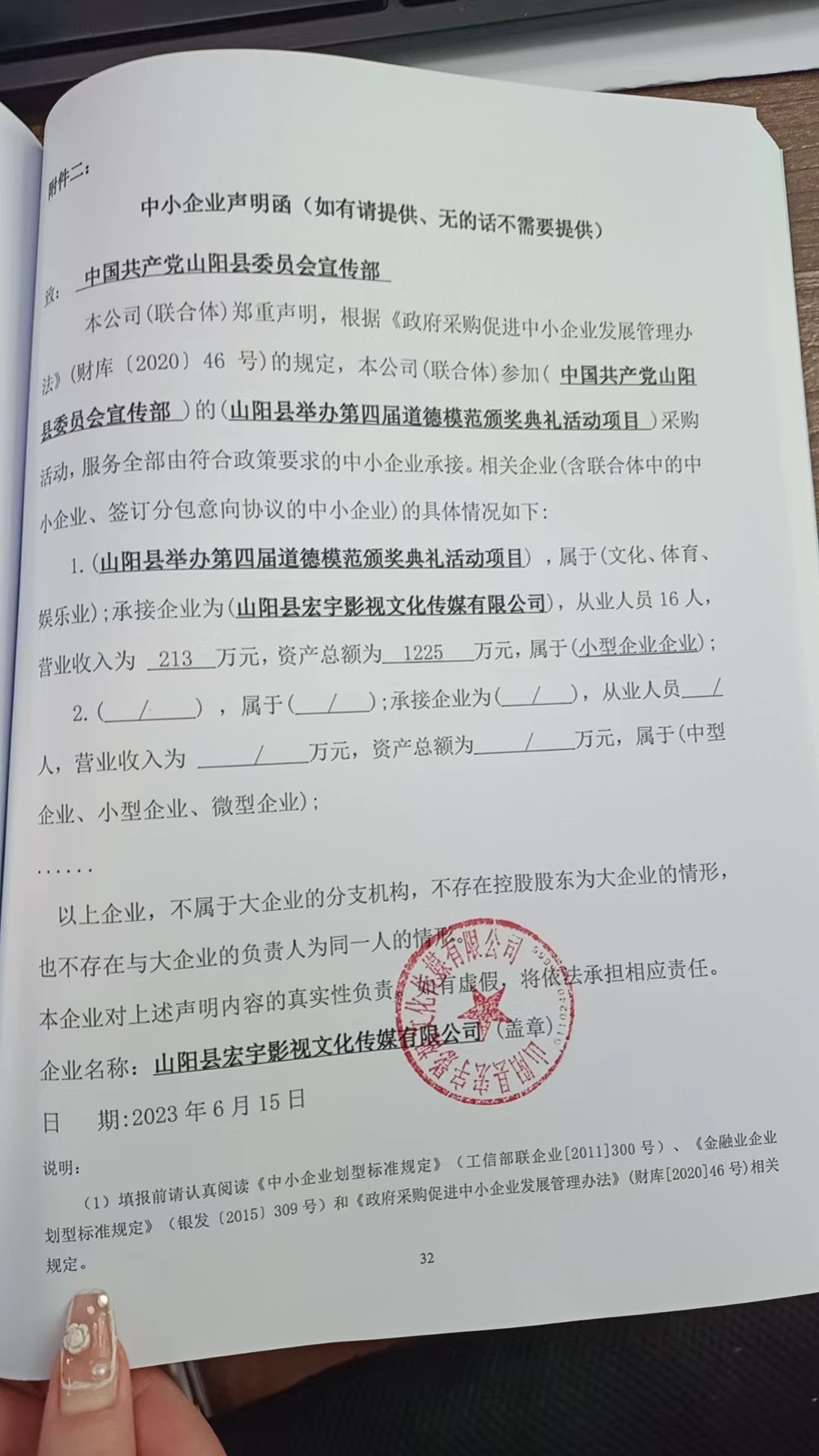 ----------------------------------招标机构发布信息原文:----------------------- 声明函.jpg 中国共产党山阳县委员会宣传部(本级)山阳县举办第四届道德模范颁奖典礼活动中标(成交)明细.pdf 十一、其他事项: ------------------------------------招标信息结束---------------------------- 标签: 中标 山阳县 颁奖典礼 第四届 模范 道德 公告 上一篇: 2023年6月26日2023年中原镇“北山粮仓”示范带稻渔(油)基地产业配套水利设施建设项目中标(成交)结果公告 最新5000条招标信息列表: 滚动招标 |
