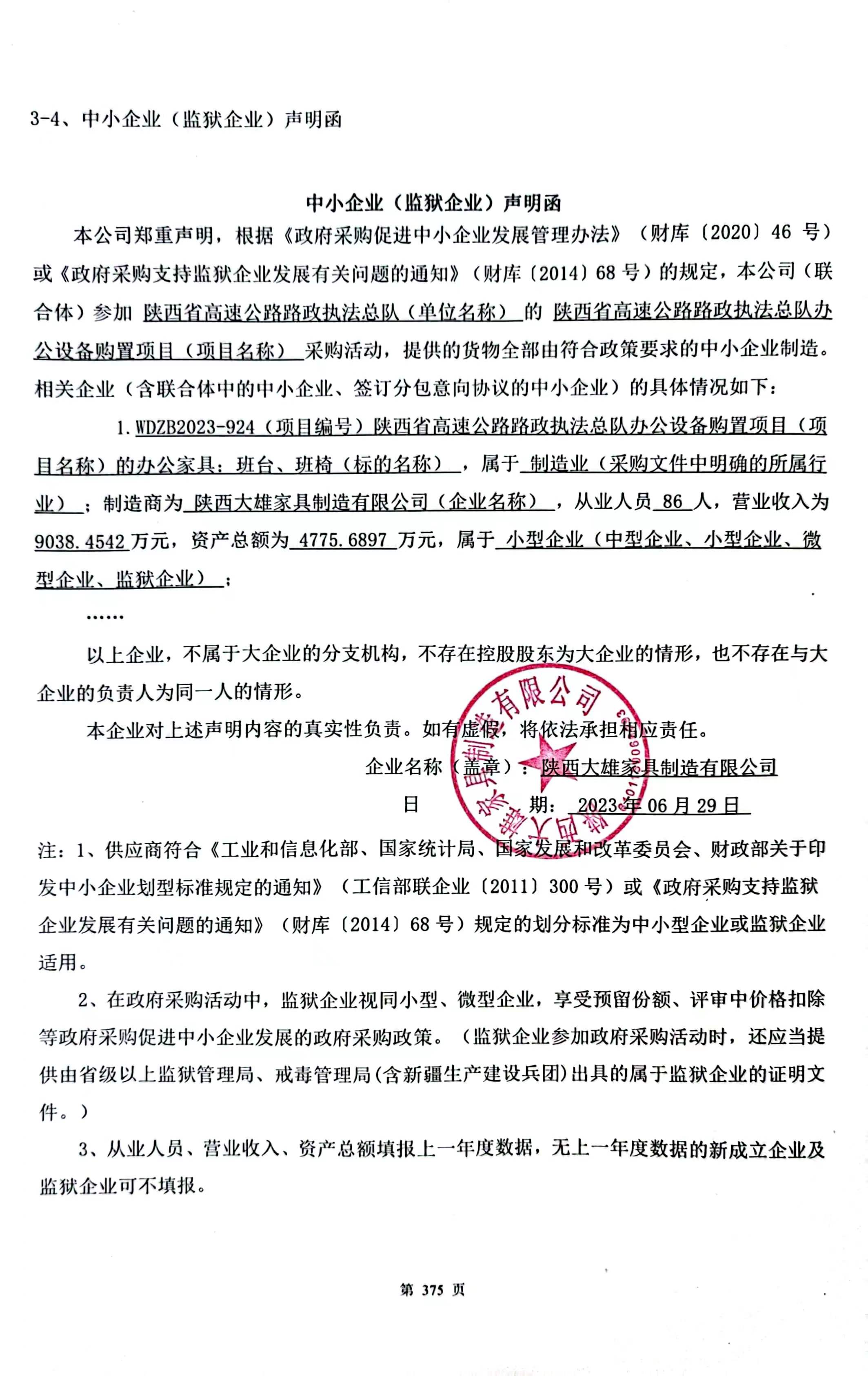 ----------------------------------招标机构发布信息原文:----------------------- 陕西省高速公路路政执法总队办公设备购置项目中标(成交)明细.pdf 中小企业声明函.jpg 924陕西省高速公路路政执法总队办公设备购置项目竞争性谈判文件发售稿.pdf 十一、其他事项: ------------------------------------招标信息结束---------------------------- 标签: 中标 项目 陕西省 路政 总队 办公设备 高速公路 上一篇: 2023年7月3日西安市莲湖区教育局西安市莲湖第三学校会议室及操场音视频采购项目中标(成交)结果公告 最新5000条招标信息列表: 滚动招标 |