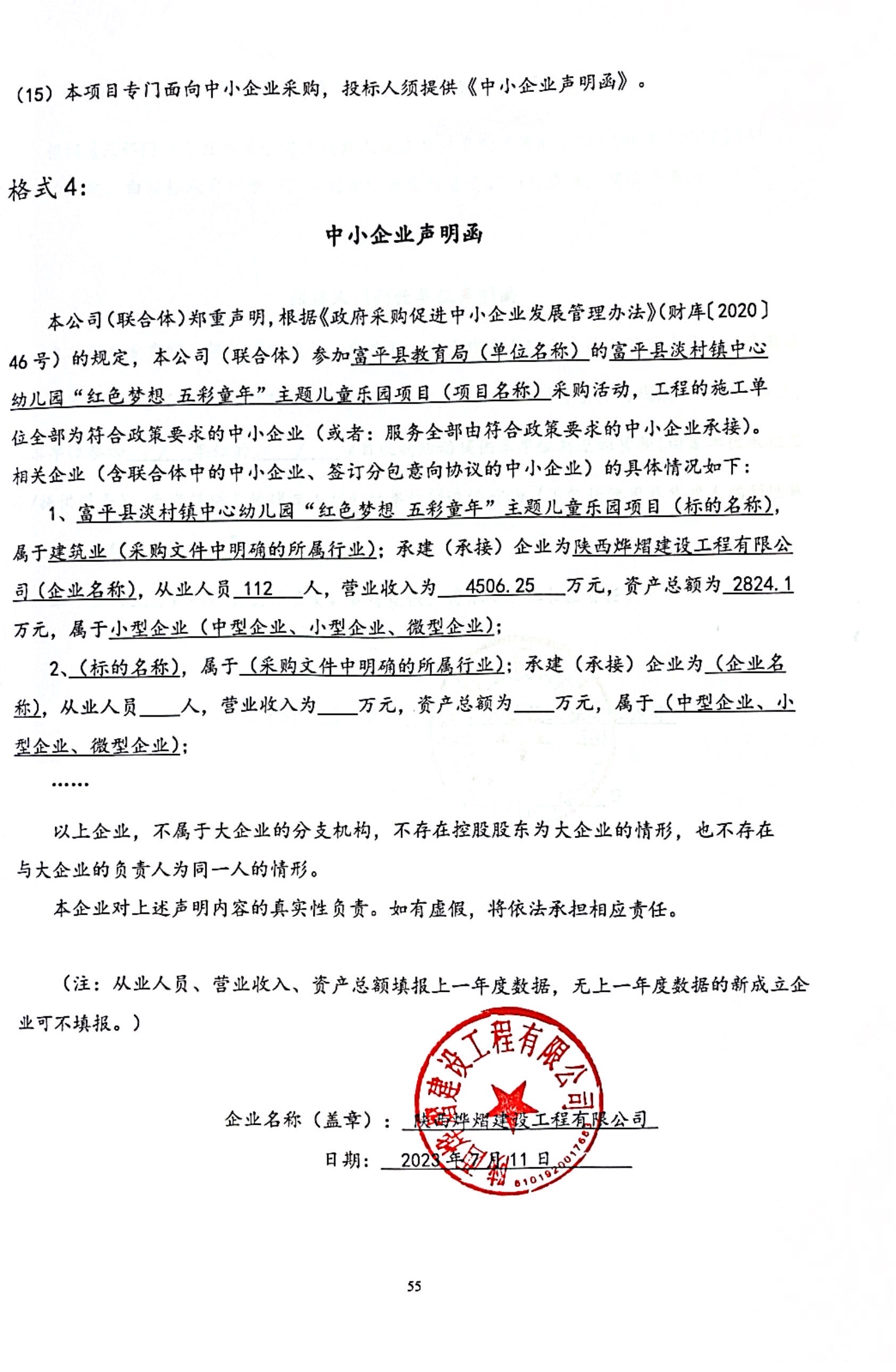 ----------------------------------招标机构发布信息原文:----------------------- 中小企业声明函.jpg 招标文件.pdf 富平县教育局(本级)富平县淡村镇中心幼儿园“红色梦想五彩童年”主题儿童乐园项目中标(成交)明细.pdf 十一、其他事项: ------------------------------------招标信息结束---------------------------- 标签: 项目 中标 幼儿园 富平县 儿童乐园 村镇 童年 上一篇: 2023年7月12日新干县潭丘乡、麦斜镇、沂江乡中心幼儿园2023年改造工程中标候选人公示 最新5000条招标信息列表: 滚动招标 |