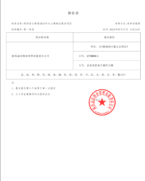 2023年7月20日陕西省公路局2023年办公楼物业服务项目中标(成交)结果公告 |
