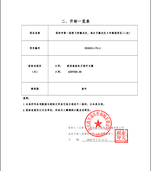 2023年7月26日西安市第一医院飞秒激光仪、准分子激光仪3年维保项目(二次)中标结果公告 |