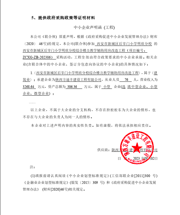 ----------------------------------招标机构发布信息原文:----------------------- 西安市新城区后宰门小学明欣分校新城区后宰门小学明欣分校综合楼及教学辅助用房改造工程中标(成交)明细.pdf 招标文件.docx 中小企业声明函.png 十一、其他事项: ------------------------------------招标信息结束---------------------------- 标签: 小学 中标 西安 综合楼 分校 改造工程 市新 上一篇: 2023年8月3日沂南县城市建成区雨污分流改造项目设计服务成交结果公告 最新5000条招标信息列表: 滚动招标 |