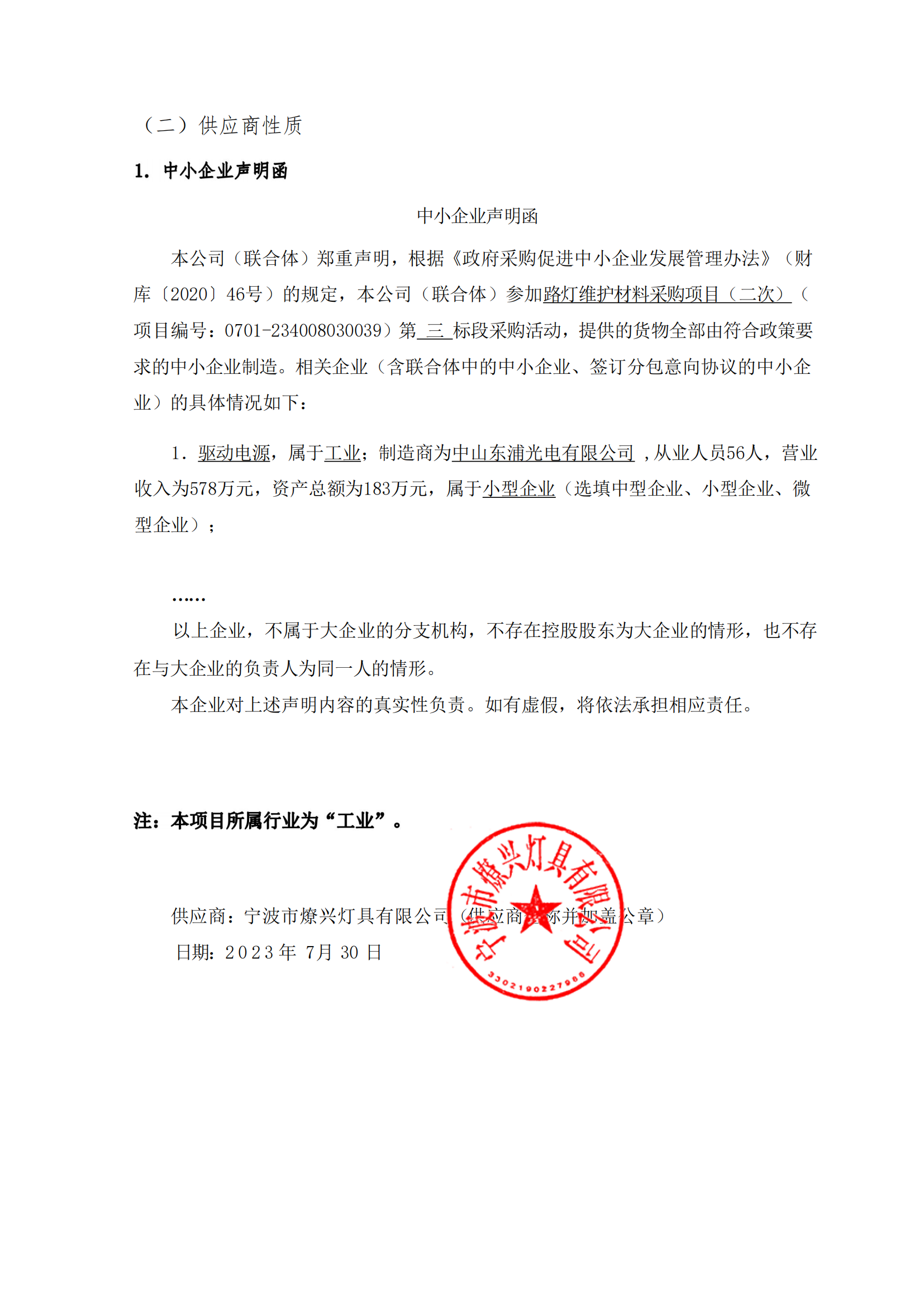 ----------------------------------招标机构发布信息原文:----------------------- 中东线缆制造有限责任公司中小企业声明函_00.png 西安市城市照明管护中心路灯维护材料采购项目-采购文件-电线电缆(二次).docx 西安市城市照明管护中心路灯维护材料采购项目-采购文件-路灯自动化监控配件(二次).docx 宁波市燎兴灯具有限公司中小企业声明函(1)_00.png 西安市城市照明管护中心路灯维护材料采购项目-采购文件-驱动电源(二次).docx 西安市城市照明管护中心路灯维护材料采购项目(二次)中标(成交)明细.pdf 十一、其他事项: ------------------------------------招标信息结束---------------------------- 标签: 采购 中标 项目 西安市 路灯 材料 公告 上一篇: 2023年8月7日2023年度至2026年度城区公厕保洁和维护项目结果公告 最新5000条招标信息列表: 滚动招标 |