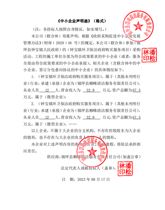 ----------------------------------招标机构发布信息原文:----------------------- 镇坪县钟宝镇人民政府(本级)钟宝镇环卫保洁政府购买服务项目中标(成交)明细.pdf 中小企业声明函(镇坪顺峰).png 十一、其他事项: ------------------------------------招标信息结束---------------------------- 标签: 中标 政府 环卫 服务项目 公告 钟宝镇 上一篇: 2023年8月21日个旧市2023年秋季学期农村义务教育学生营养改善计划大宗食材集中采购中标结果公告 最新5000条招标信息列表: 滚动招标 |