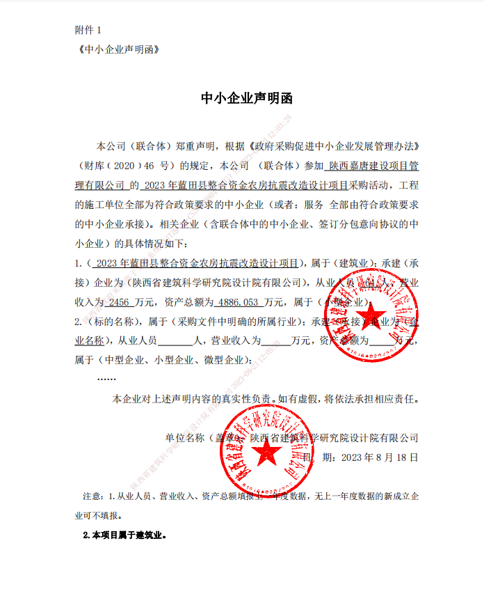 ----------------------------------招标机构发布信息原文:----------------------- 2023年蓝田县整合资金农房抗震改造设计项目报价明细附件.pdf 2023年蓝田县整合资金农房抗震改造设计项目-文件集.zip 【合同包1】报价表(陕西省建筑科学研究院设计院有限公司)(2023年蓝田县整合资金农房抗震改造设计项目).pdf 中小企业声明函.png 十一、其他事项: ------------------------------------招标信息结束---------------------------- 标签: 中标 项目 蓝田县 建设局 西安市 城乡 住房 上一篇: 2023年8月25日松原市中心医院(松原市儿童医院)健康一体化系统项目中标公告 最新5000条招标信息列表: 滚动招标 |