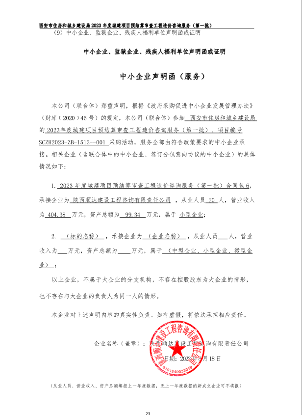 ----------------------------------招标机构发布信息原文:----------------------- 西安市住房和城乡建设局(本级)西安市住房和城乡建设局2023年度城建项目预结算审查工程造价咨询服务(第一批)中标(成交)明细.pdf 报价清单合同包一 凌辉.png 报价清单 合同包二 正源.png 报价清单 合同包三华智建.png 报价清单 合同包四 陕西中扬德.png 报价清单 合同包五 陕西容天源.png 报价清单 合同包六 陕西顺达.png 报价清单 合同包七 衡正.png 报价清单 合同包八 陕西汉之初.png 报价清单 合同包九 瑞恒.png 报价清单 合同包十 正衡.png 报价清单 合同包十一 陕西希地.png 报价清单 合同包十二 华建源.png 中小企业声明函合同包一 凌辉.png 中小企业声明函合同包二 正源.png 中小企业声明函合同包三 华智建.png 中小企业声明函 合同包四 陕西中扬德.png 中小企业声明函合同包五 陕西容天源.png 中小企业声明函 合同包六 陕西顺达.png 中小企业声明函 合同包七 衡正.png 中小企业声明函 合同包八 陕西汉之初.png 中小企业声明函 合同包九 瑞恒.png 中小企业声明函 合同包十一 陕西希地.png 中小企业声明函 合同包十二 华建源.png 2023年度城建项目预结算审查工程造价咨询服务(第一批)招标文件.pdf 十一、其他事项: ------------------------------------招标信息结束---------------------------- 标签: 中标 项目 建设局 西安市 城建 工程造价 城乡 上一篇: 2023年8月25日泉州五中桂坛校区校园基础设施改造提升结果公告(采购包1) 最新5000条招标信息列表: 滚动招标 |