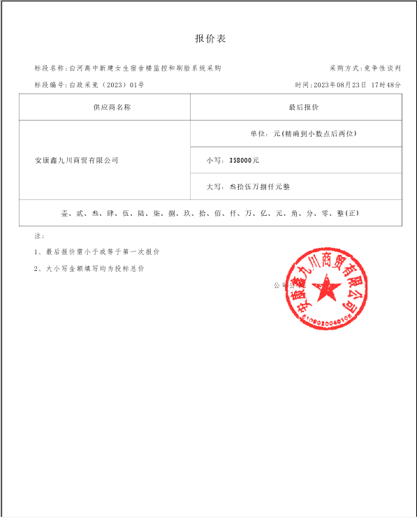 2023年8月28日白河高中新建女生宿舍楼监控和刷脸系统采购中标(成交)结果公告 |