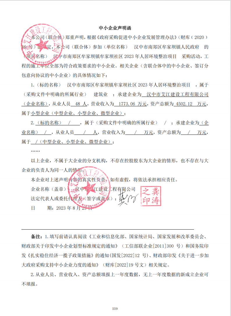----------------------------------招标机构发布信息原文:----------------------- 南郑县牟家坝镇政府汉中市南郑区牟家坝镇牟家坝社区2023年人居环境整治项目中标(成交)明细.pdf 中标供应商(中小企业声明函).png 十一、其他事项: ------------------------------------招标信息结束---------------------------- 标签: 项目 中标 南郑 汉中市 人居 环境整治 公告 上一篇: 2023年8月31日石狮市第一中学食堂委托经营采购项目中标公告 最新5000条招标信息列表: 滚动招标 |