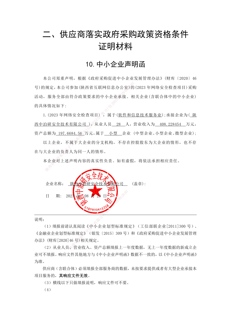 ----------------------------------招标机构发布信息原文:----------------------- 2023年网络安全检查项目报价明细附件.pdf 2023年网络安全检查项目-文件集.zip 中泊研中小企业声明函.png 推荐供应商相关资料.pdf 十一、其他事项: ------------------------------------招标信息结束---------------------------- 标签: 项目 网络 陕西省 互联网 安全检查 办公室 公告 上一篇: 2023年9月1日铜山区柳泉镇镇村市场化保洁服务项目中标公告 最新5000条招标信息列表: 滚动招标 |