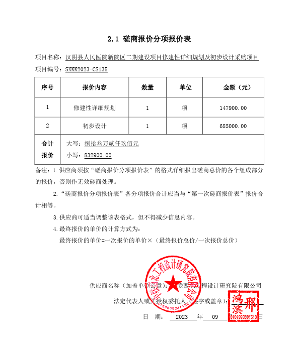 ----------------------------------招标机构发布信息原文:----------------------- 终版【磋商文件】汉阴县人民医院新院区二期建设项目修建性详细规划及初步设计采购项目(1) - 副本.doc 汉阴县人民医院新院区二期建设项目修建性详细规划及初步设计采购项目中标(成交)明细.pdf 二次报价表.png 分项报价表.png 十一、其他事项: ------------------------------------招标信息结束---------------------------- 标签: 项目 中标 采购 汉阴县 二期 建设项目 人民医院 上一篇: 2023年9月6日甘肃财贸职业学院教学成果培育指导咨询服务项目中标公告 最新5000条招标信息列表: 滚动招标 |