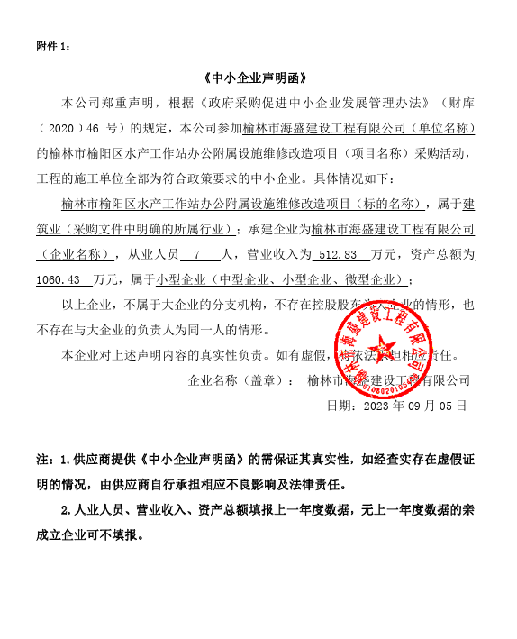 2023年9月6日榆林市榆阳区水产工作站办公附属设施维修改造项目中标(成交)结果公告 |