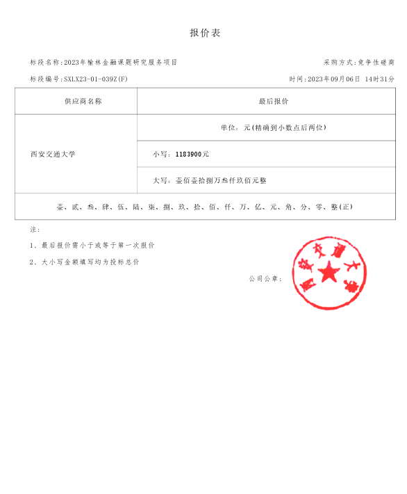 2023年9月7日榆林市地方金融工作局2023年金融课题研究服务项目中标(成交)结果公告 |