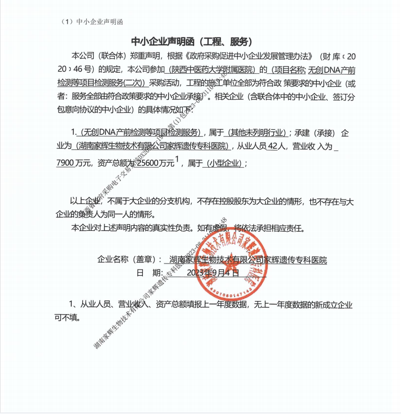 ----------------------------------招标机构发布信息原文:----------------------- 无创DNA产前检测等项目检测服务(二次)报价明细附件.pdf 无创DNA产前检测等项目检测服务(二次)-文件集.zip 湖南家辉生物技术有限公司家辉遗传专科医院.pdf 中小企业声明函.png 十一、其他事项: ------------------------------------招标信息结束---------------------------- 标签: 项目 陕西 产前 附属医院 中医药大学 公告 DNA 上一篇: 2023年9月11日长沙绅嘉物业管理有限公司四方嘉苑(A1-A4栋)既有小区品质提升维修改造及消防维修改造工程中标公告 最新5000条招标信息列表: 滚动招标 |