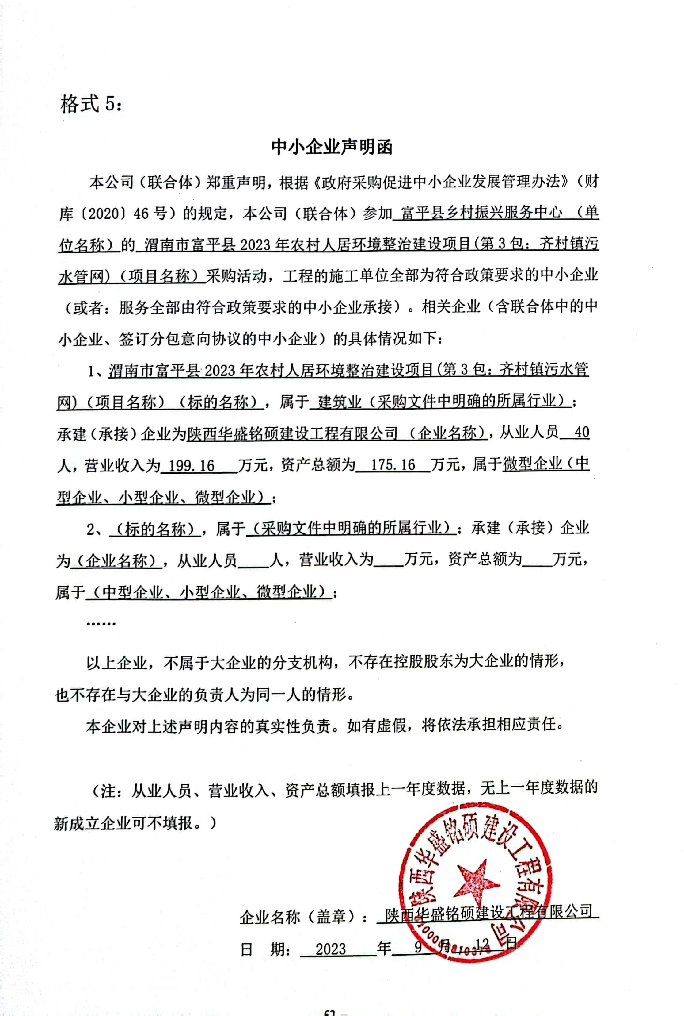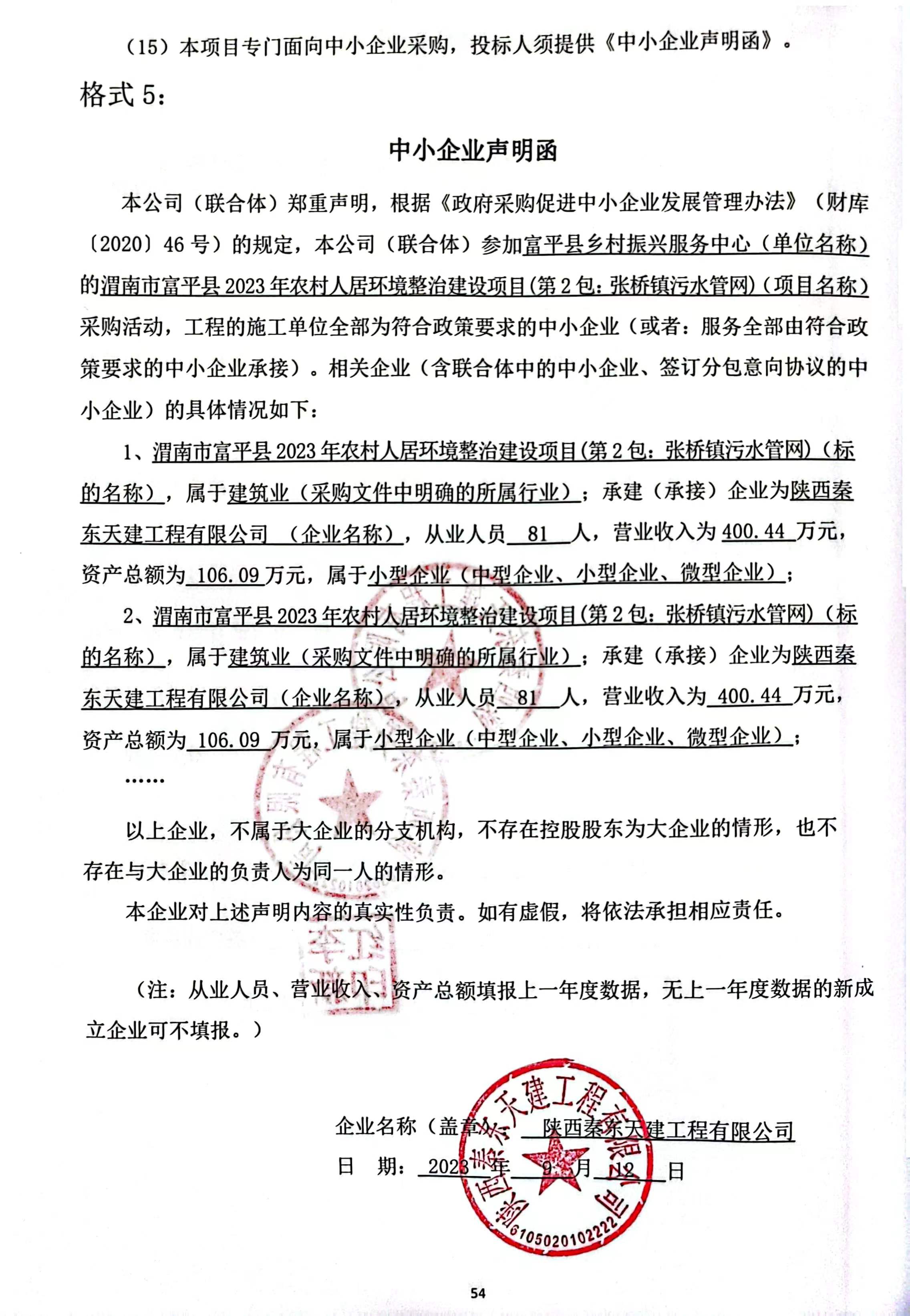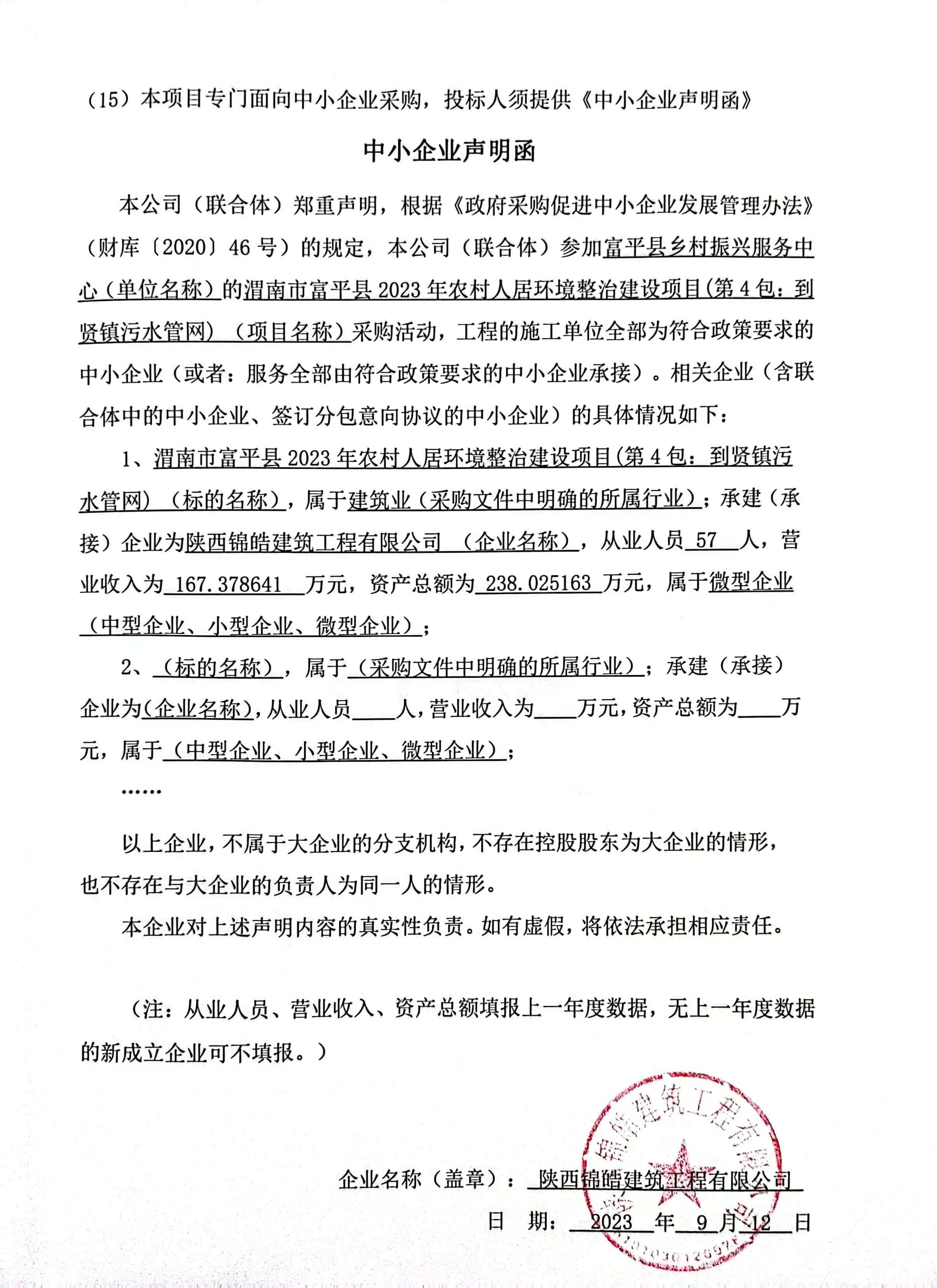 ----------------------------------招标机构发布信息原文:----------------------- 1包中小企业声明函.pdf (第1包:留古镇污水管网)定稿).docx 2包中小企业声明函.jpg (第2包:张桥镇污水管网)定稿.docx 3包中小企业声明函.jpg 第3包:齐村镇污水管网.定稿.docx 第4包:到贤镇污水管网.定稿.docx 4包中小企业声明函.jpg 富平县乡村振兴服务中心渭南市富平县2023年农村人居环境整治建设项目中标(成交)明细.pdf 十一、其他事项: ------------------------------------招标信息结束---------------------------- 标签: 中标 富平县 渭南市 人居 建设项目 乡村 服务中心 上一篇: 2023年9月13日辽宁省烟草公司沈阳市公司2023-2024年叉车维修零配件及服务采购项目中标公告 最新5000条招标信息列表: 滚动招标 |