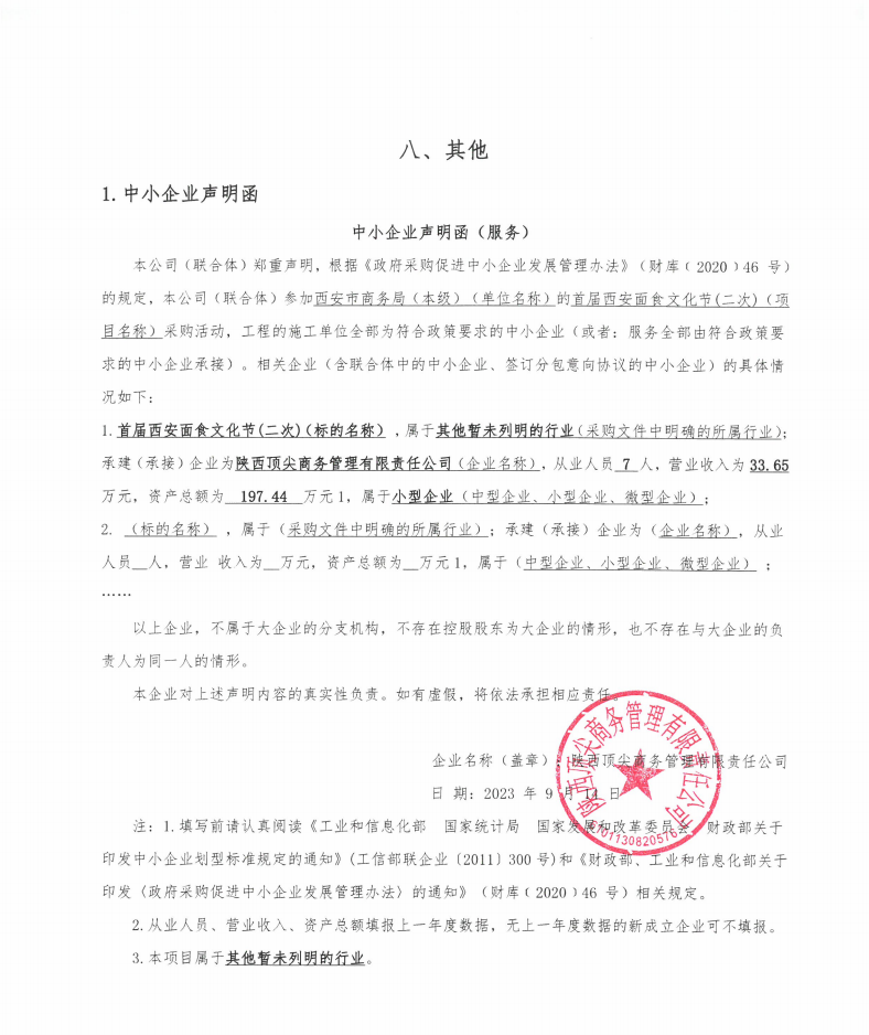 ----------------------------------招标机构发布信息原文:----------------------- (定稿)首届西安面食文化节二次.pdf 中小企业声明函.png 西安市商务局(本级)首届西安面食文化节(二次)中标(成交)明细.pdf 十一、其他事项: ------------------------------------招标信息结束---------------------------- 标签: 中标 西安 西安市 面食 文化节 商务局 公告 上一篇: 2023年9月16日玉门市农业农村局玉门市2023年高标准农田建设项目(监理)中标公告 最新5000条招标信息列表: 滚动招标 |