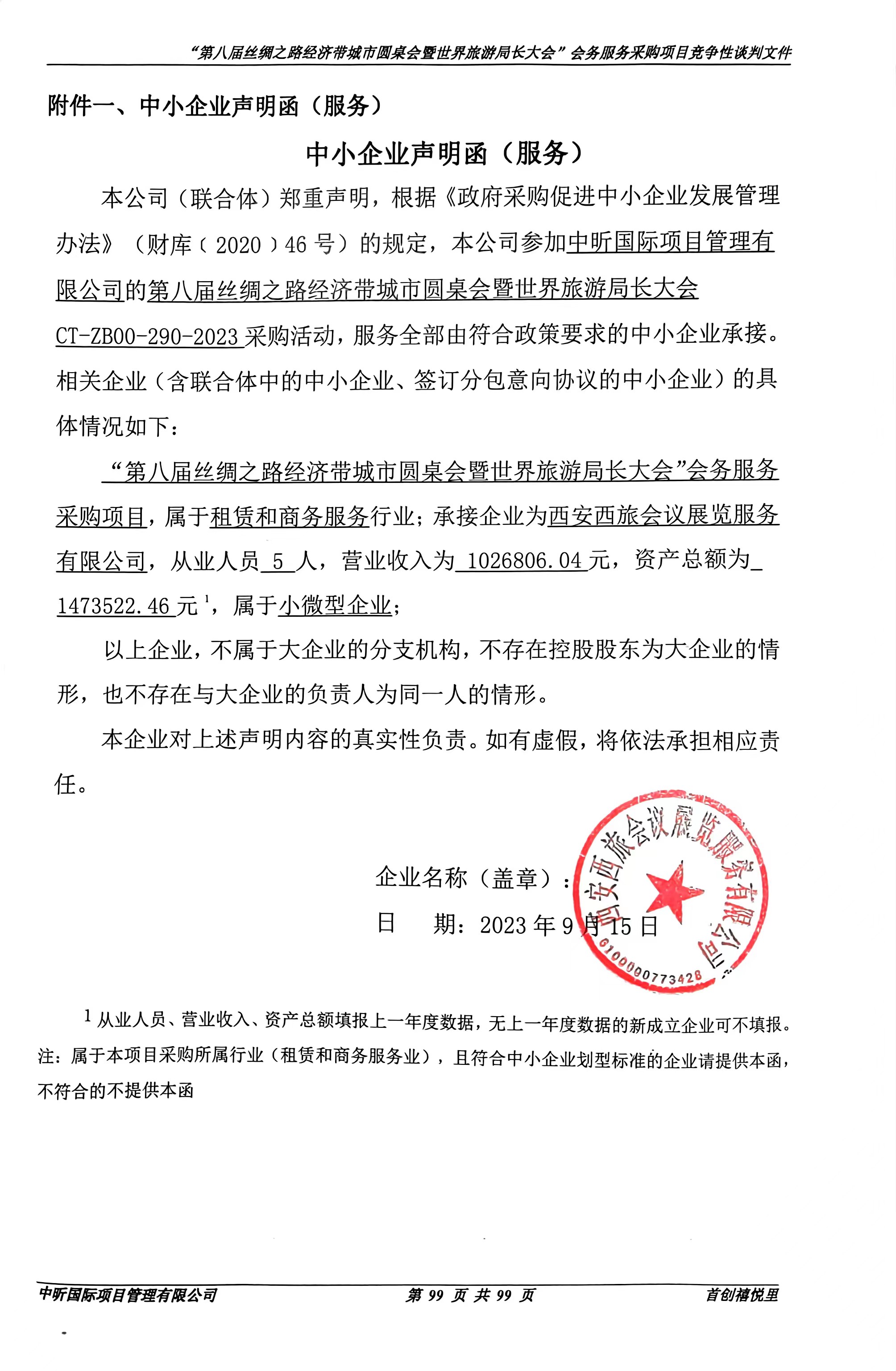 ----------------------------------招标机构发布信息原文:----------------------- 西安市对外友好城市交流中心“第八届丝绸之路经济带城市圆桌会暨世界旅游局长大会”会务服务中标(成交)明细.pdf “第八届丝绸之路经济带城市圆桌会暨世界旅游局长大会”会务服务采购项目竞争性谈判文件(发标版2.0)(1).doc 小微企业声明函.jpg 最终谈判报价表.pdf 十一、其他事项: ------------------------------------招标信息结束---------------------------- 标签: 中标 西安市 友好城市 圆桌 会务 交流中心 第八届 上一篇: 2023年9月19日2023年香城固镇小屯村美丽乡村建设项目竞争性磋商中标公告 最新5000条招标信息列表: 滚动招标 |