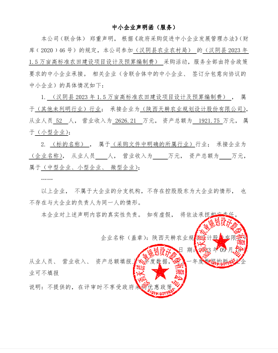 ----------------------------------招标机构发布信息原文:----------------------- 汉阴县农业农村局汉阴县2023年1.5万亩中央预算内高标准农田建设项目设计及预算编制费中标(成交)明细.pdf 中小企业声明函.png 十一、其他事项: ------------------------------------招标信息结束---------------------------- 标签: 中标 中央 汉阴县 农田 建设项目 高标准 预算编制 上一篇: 2023年9月21日合阳县教育局合阳县九龙幼儿园活动用房维修改造项目中标(成交)结果公告 最新5000条招标信息列表: 滚动招标 |