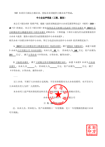 ----------------------------------招标机构发布信息原文:----------------------- 岚皋县孟石岭镇人民政府2023年孟石岭镇农村公路建设项目中标(成交)明细.pdf 孟石岭镇农村公路建设项目磋商文件.docx 中小企业声明函.png 十一、其他事项: ------------------------------------招标信息结束---------------------------- 标签: 建设项目 农村公路 公告 年孟石岭镇 上一篇: 2023年10月7日浙江省建设工程设备招标有限公司关于中华人民共和国杭州海关黄龙办公区电梯改造项目中标公告 最新5000条招标信息列表: 滚动招标 |