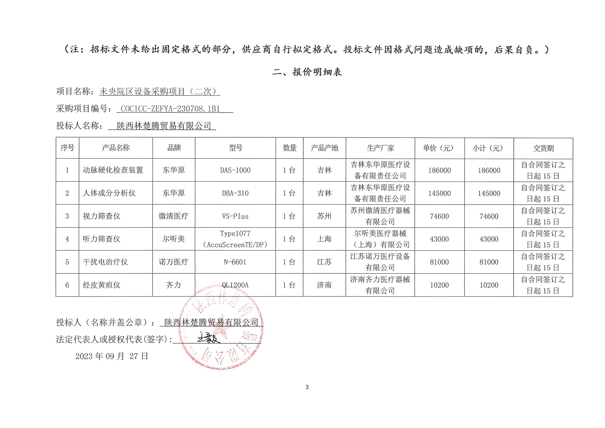 ----------------------------------招标机构发布信息原文:----------------------- 未央院区设备采购项目(二次)报价明细附件.pdf 未央院区设备采购项目(二次)-文件集.zip 报价明细表.jpg 十一、其他事项: ------------------------------------招标信息结束---------------------------- 标签: 项目 中标 西安 医学院 附属医院 设备采购 公告 上一篇: 2023年10月9日2023年图书馆图书及书架采购项目的中标(成交)结果公告 最新5000条招标信息列表: 滚动招标 |