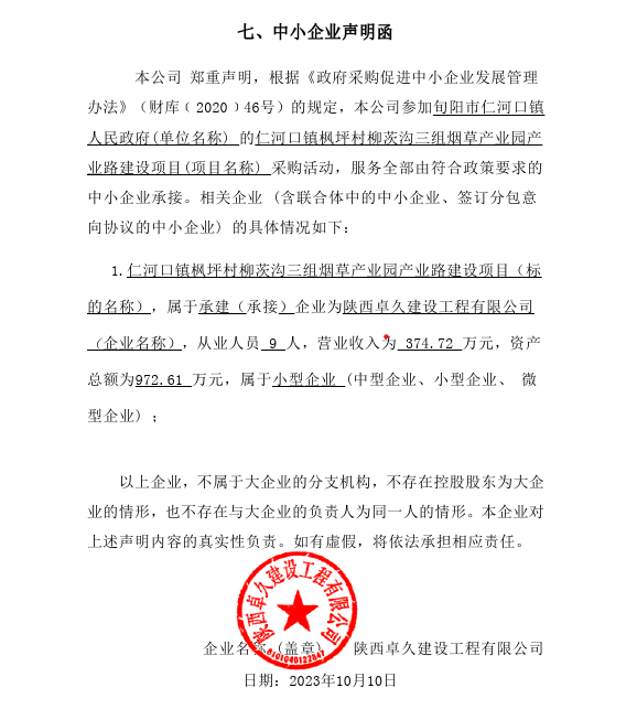 2023年10月12日仁河口镇枫坪村柳茨沟三组烟草产业园产业路建设项目中标(成交)结果公告 |